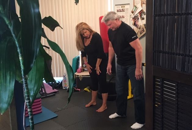 Warren Moore’s personal trainer and life partner, Dina McDermott, walks him through some gentle stretches. She reminds him it’s not a race, but rather a slow process to get his body back in shape.