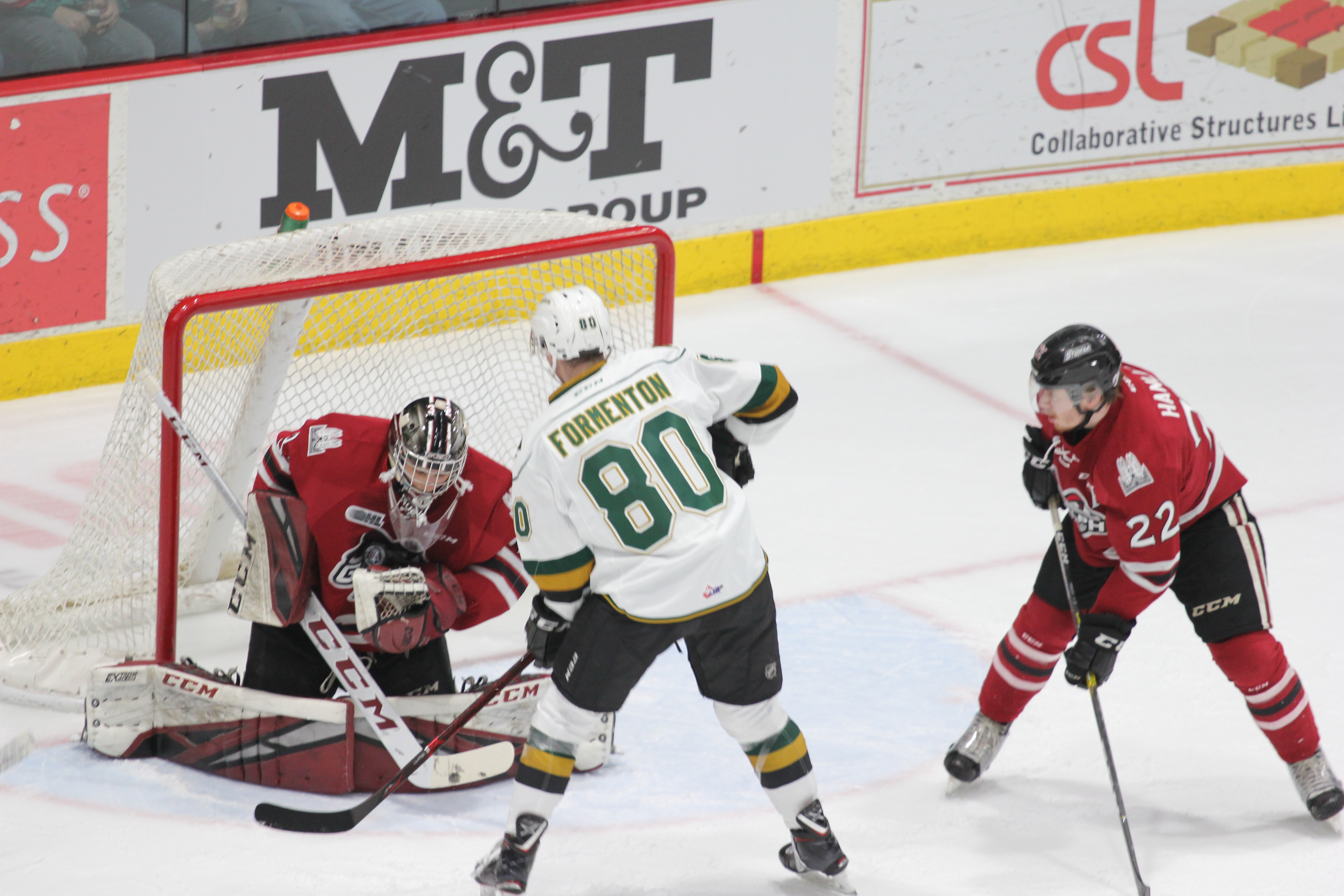 Londoner Isaac Ratcliffe tied the game 7:01 into the second period as he used his deft hands at the side of the net to grab a puck and slice it over Jordan Kooy of the Knights to make it 1-1.