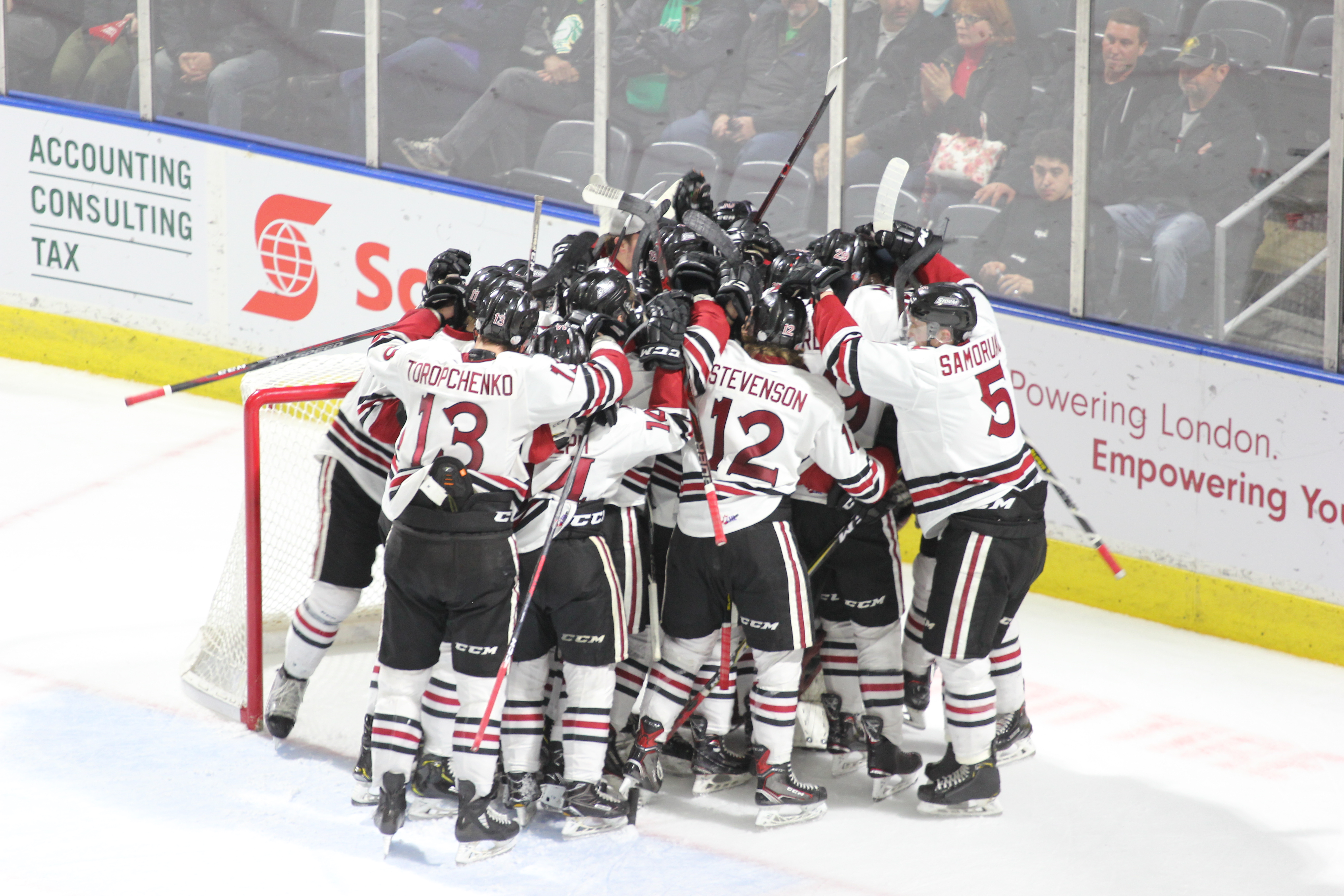 London had built their 3-1 lead in the game, scoring three goals in a span of 2:54 early in the second period, after Guelph had scored the only goal of the first period.