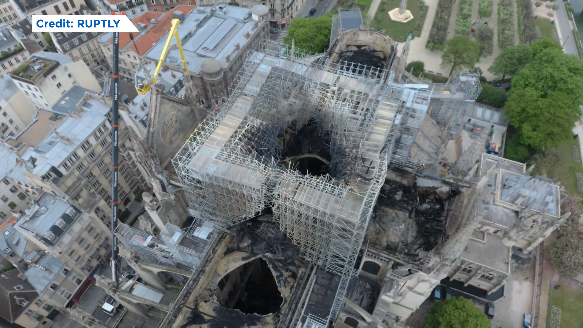 The damage to the 800-year-old church, as seen from above in video captured by drone, looks extensive.