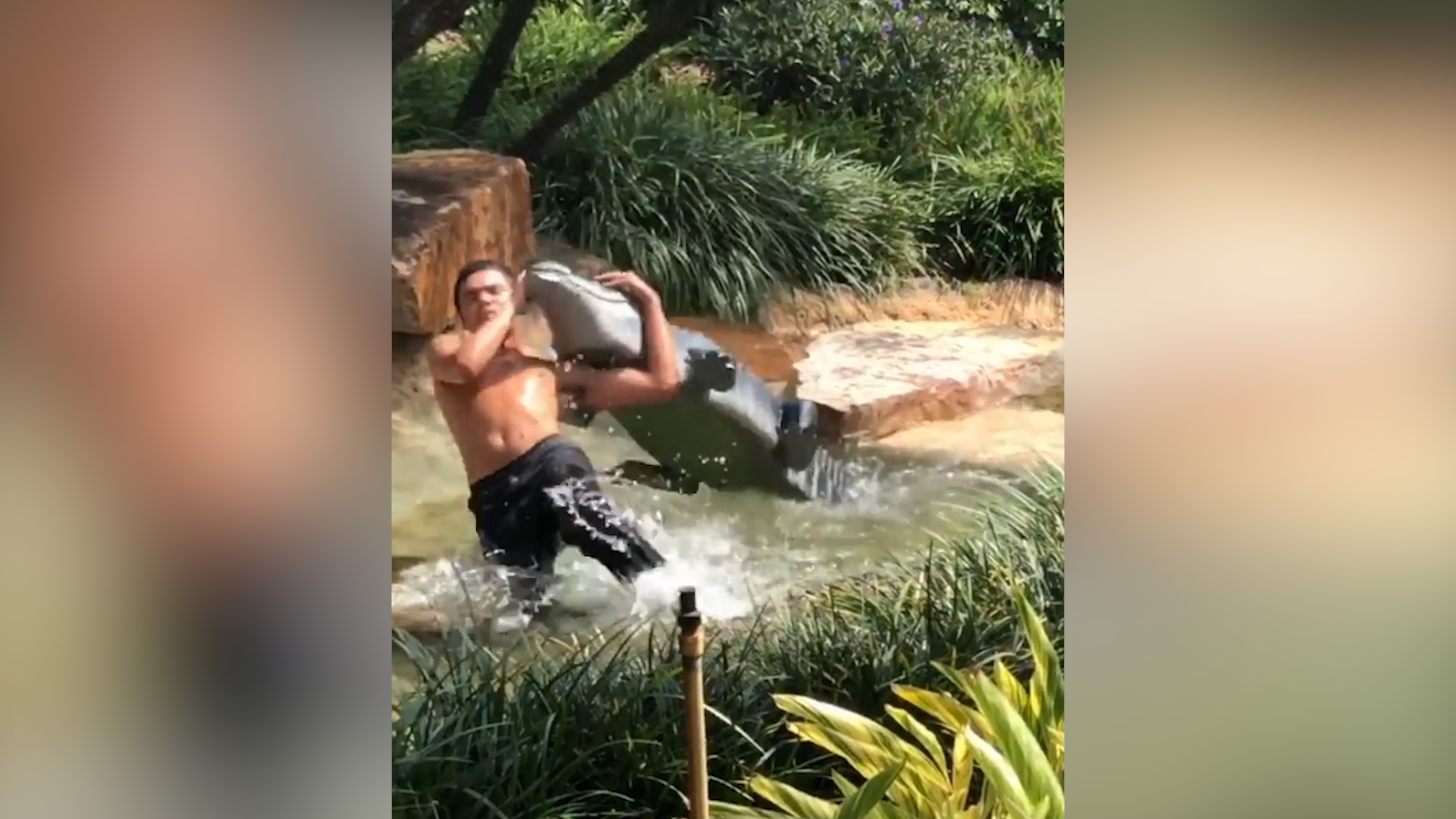 The footage shows Sosa-Hernandez picking up the fake ‘gator, tossing it into the water before jumping off a rock, attempting to land an elbow onto the plastic display piece. The tough guy is then seen picking up the fake gator and performing the “finishing move” known as “RKO” (named after wrestler Randal Keith Orton), on the lifeless alligator.