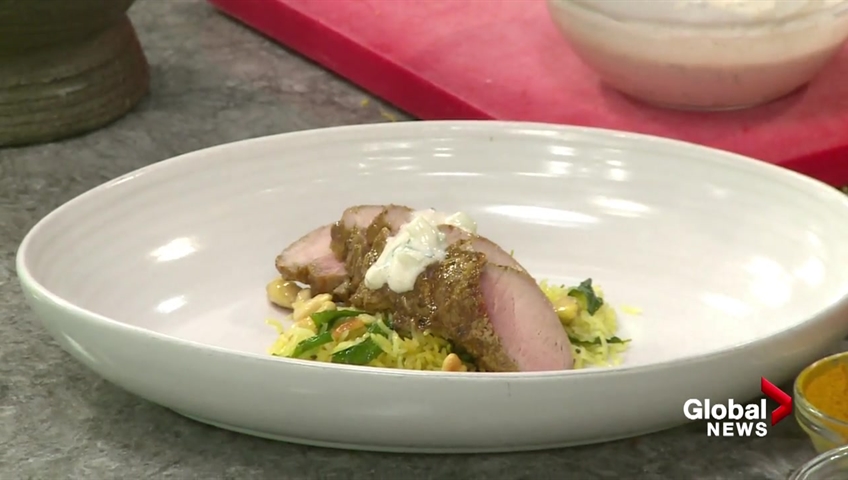 Place a large pan over medium-high heat, and season pan with grapeseed oil until the pan is evenly coated. While heating the pan, dab pork tenderloin with a paper towel and then season with salt & pepper, and rub South Indian Spiced Rub into pork tenderloin. Be generous and ensure the tenderloin is coated evenly.