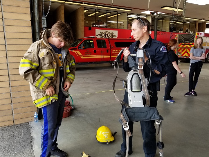The students, from Kelowna Secondary and Okanagan Mission, got to experience dragging and hooking up hoses, climbing ladders on fire trucks, using fire extinguishers, and using a self-contained breathing apparatus.