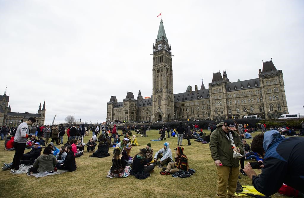 Protesters dotted one half of Parliament Hill’s front lawn on a blustery, rainy Saturday at the climax the first 4-20 “Weed Day” demonstration since Canada legalized recreational marijuana.
