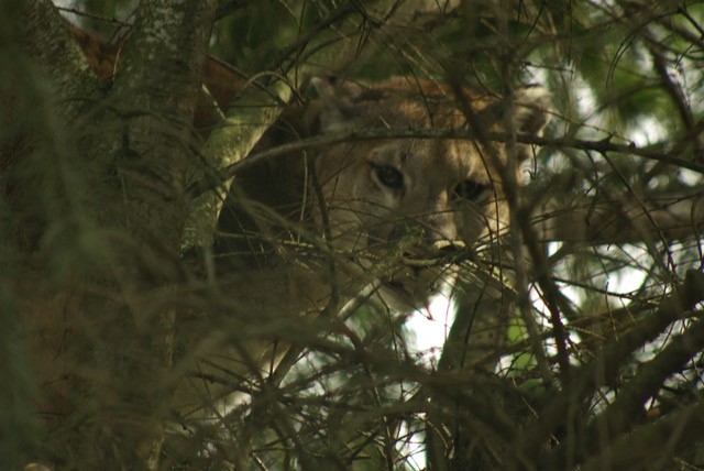 Lutz-Noel says the cougar abandoned the chase and climbed about 15 feet up a tree.