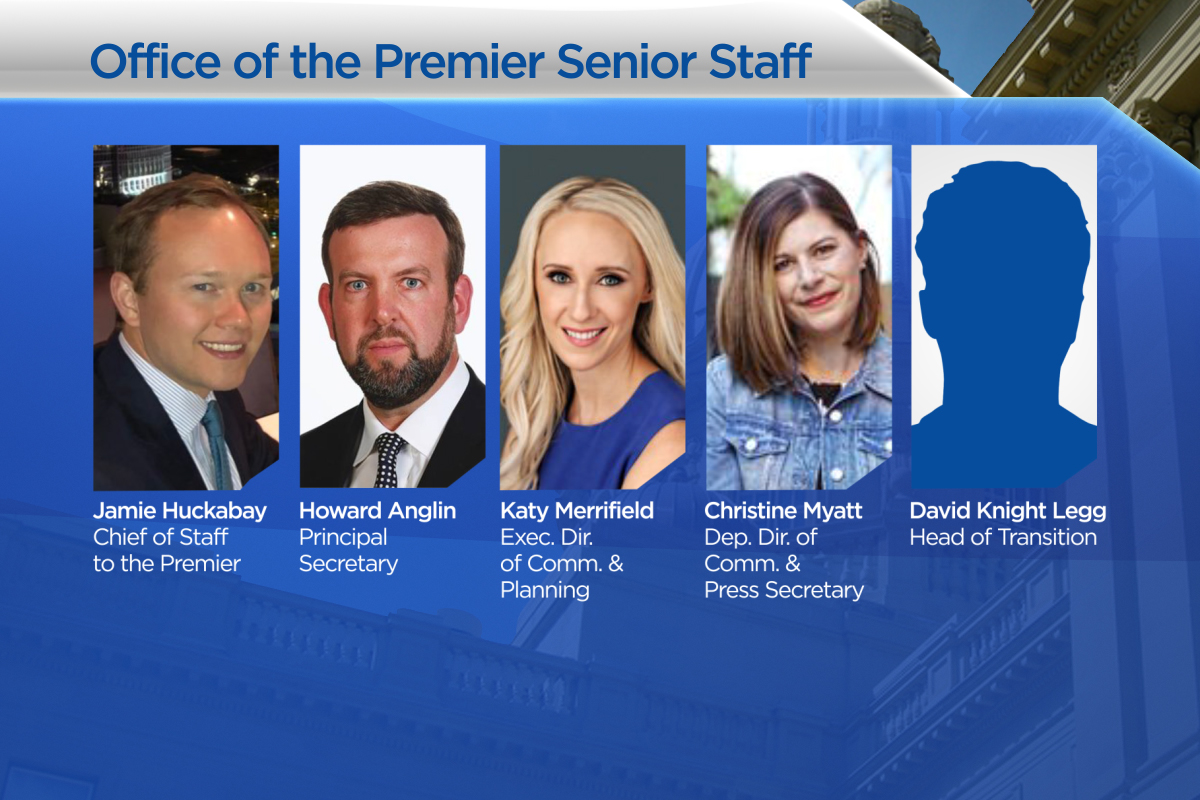 Jamie Huckabay has been named chief of staff to the premier, Howard Anglin will be principal secretary, Katy Merrifield is stepping in as executive director of communication and planning, Christine Myatt has been announced deputy director of communications and press secretary and David Knight Legg will be head of transition.