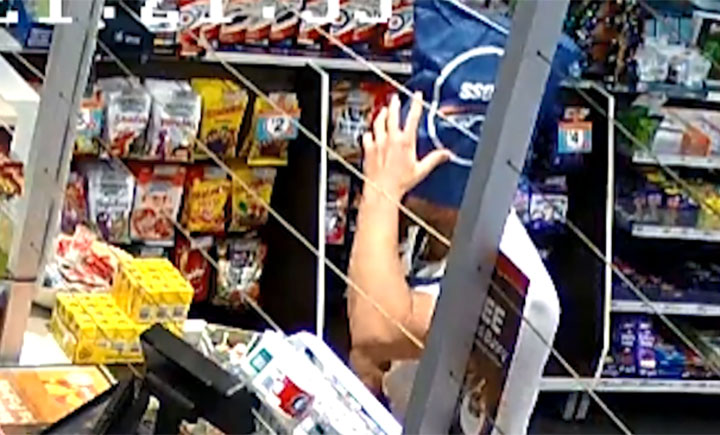 The store clerk then opens a second cash drawer, showing the suspect that it’s empty. The employee then grabs several packs of smokes while the alleged thief removes the bag from over his head, loading it with cigarettes before leaving the store.
