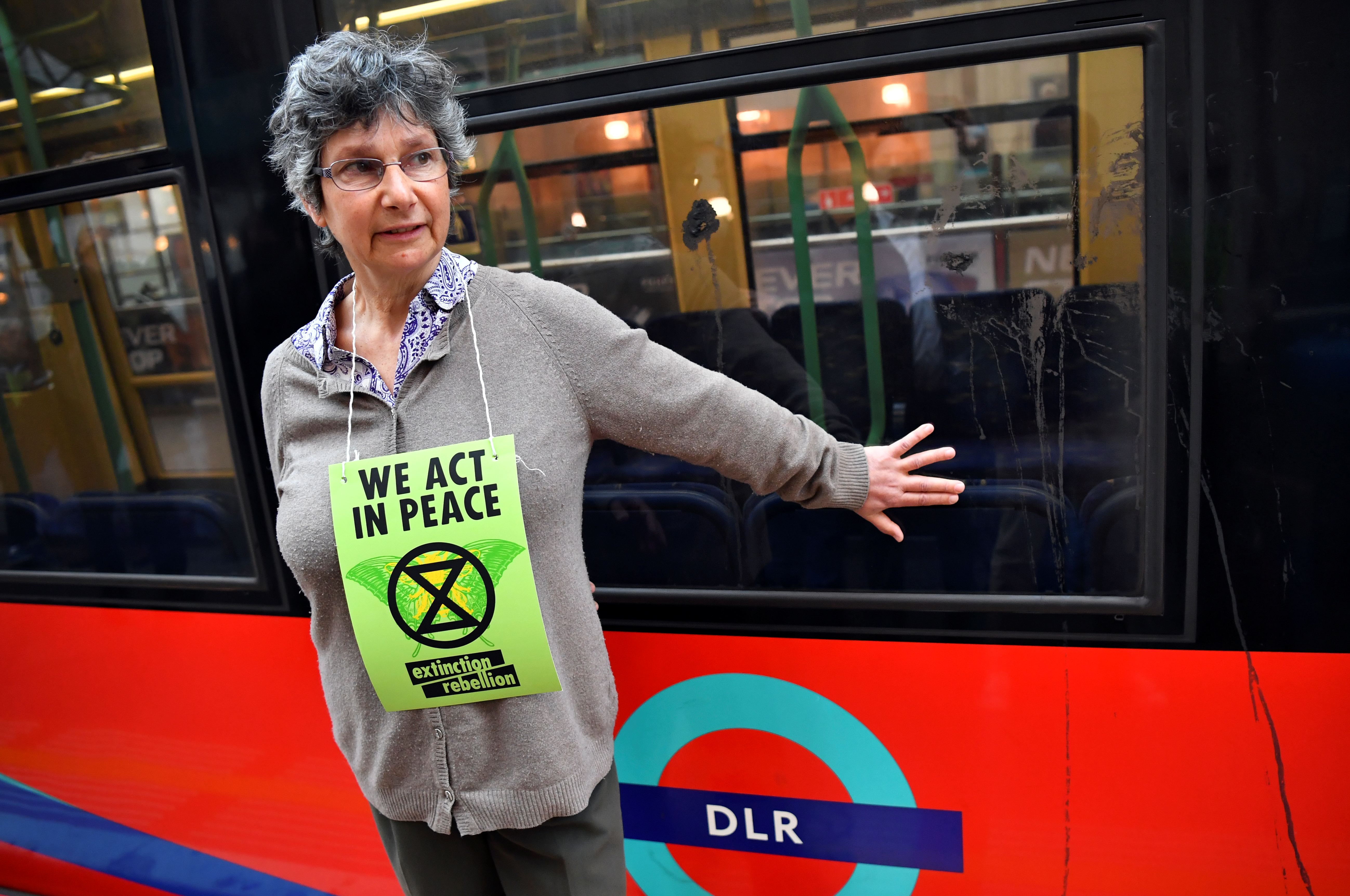In Canary Wharf, five protesters from the group climbed aboard a train at the Docklands Light Railway (DLR) station and unfurled a banner which read: “Business as usual = Death.” One glued herself to a train.