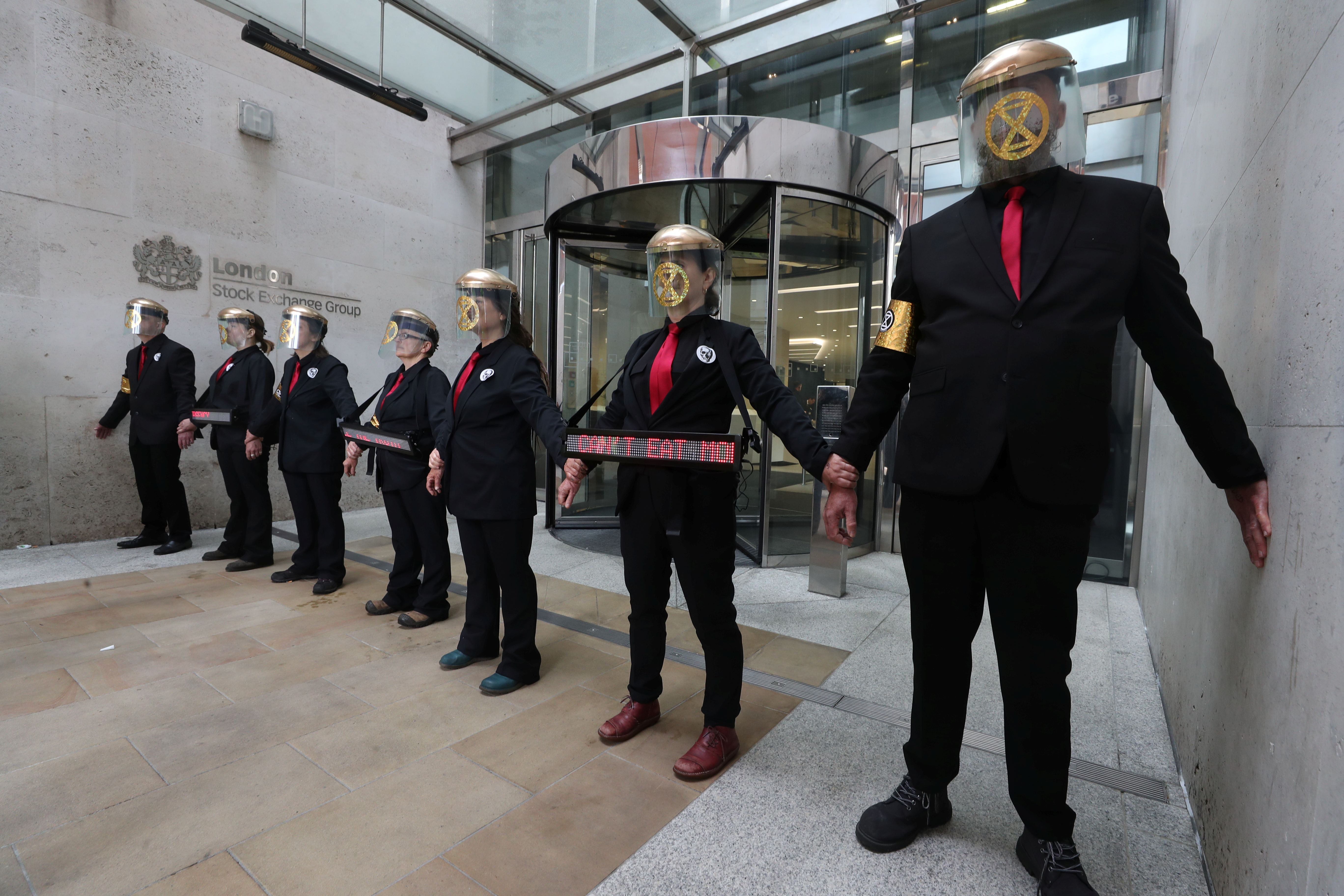 At the London Stock Exchange‘s headquarters, seven protesters dressed in black suits and red ties were blocking the revolving doors of the building. They held signs reading “Tell the truth” and “You can’t eat money.”