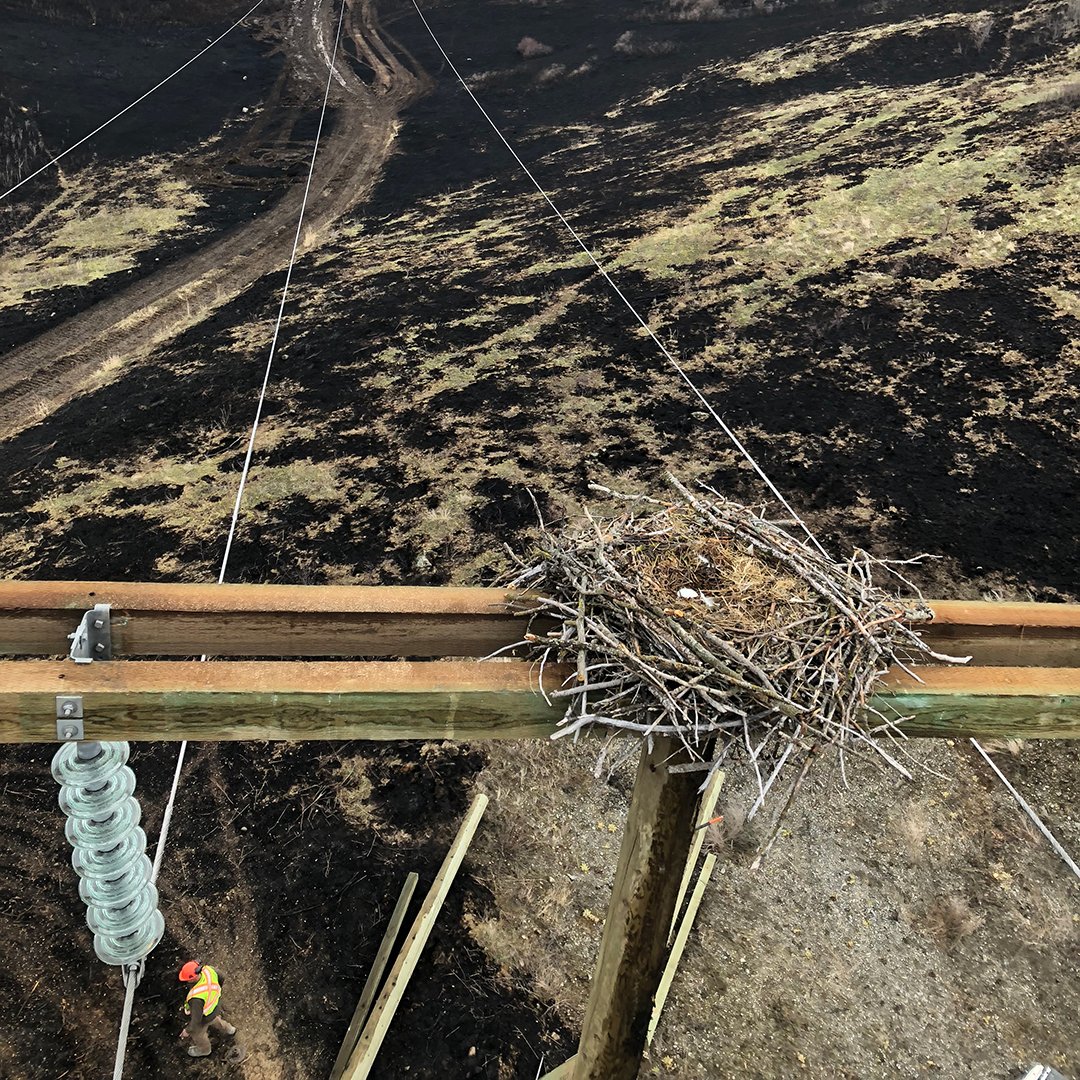 Crews headed out on April 3 to replace six poles damaged by the fire, joined by environment experts to help them move the nest and a single egg without unduly disturbing them.