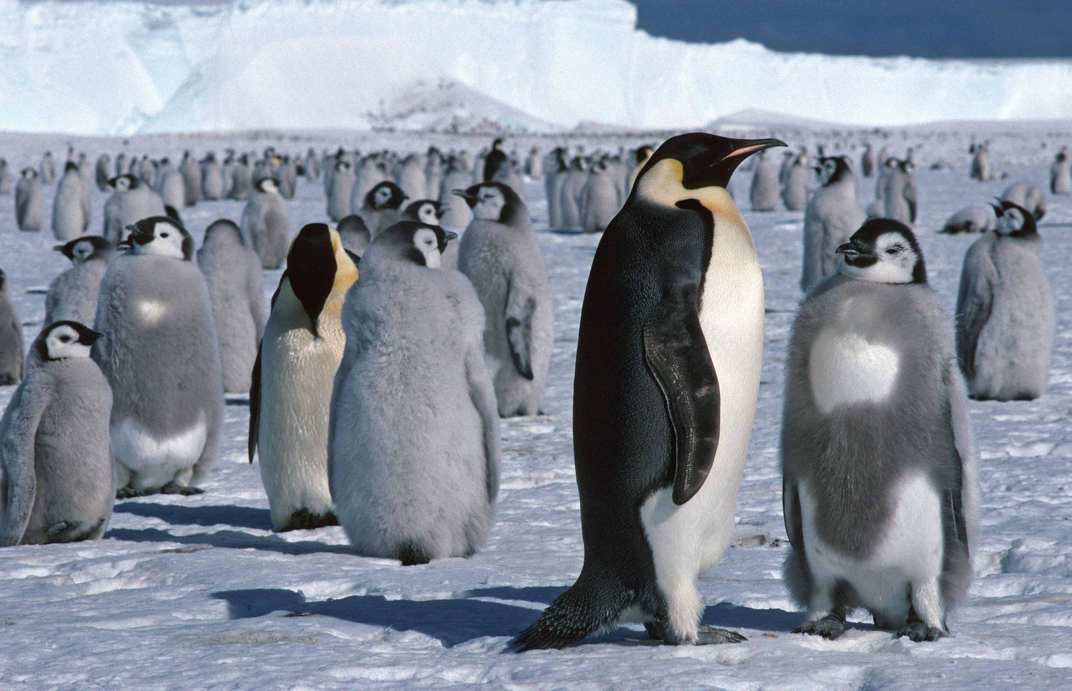 Black-and-white with yellow ears and breasts, emperor penguins are the largest penguin species, weighing up to 40 kilograms and living about 20 years. Pairs breed in the harshest winter conditions with the male incubating their egg.