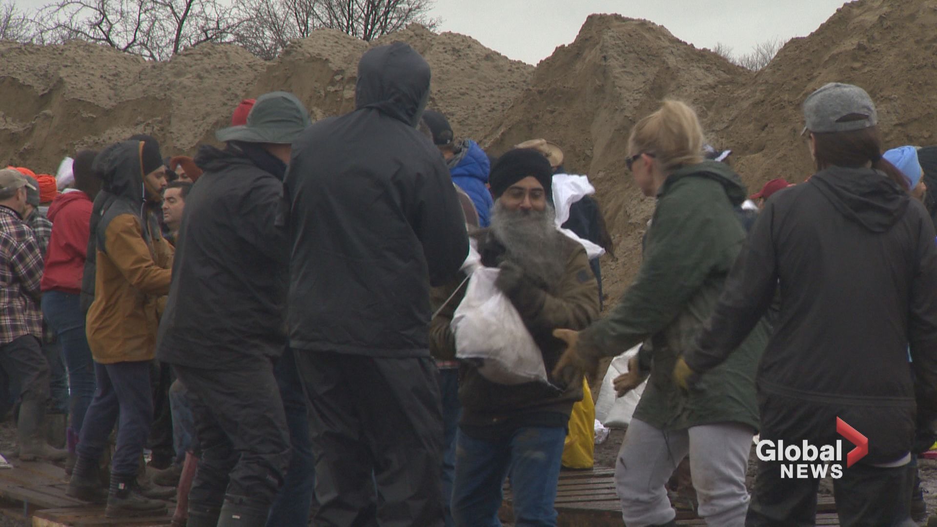 Hundreds of volunteers, some coming from as far as Toronto, as well as city workers, have been working non-stop for more than a week filling and distributing sandbags to protect homes and shore up natural dikes.
