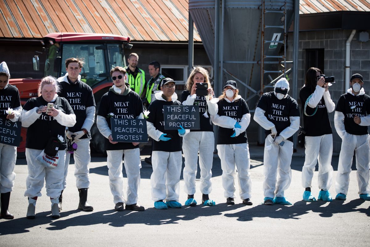 Dan Moskaluk, former RCMP officer and one of the organizers of the protest, said the protesters had come together from across North America to “speak out against the cruelty of the agriculture industry and to stand in solidarity with the animals.”