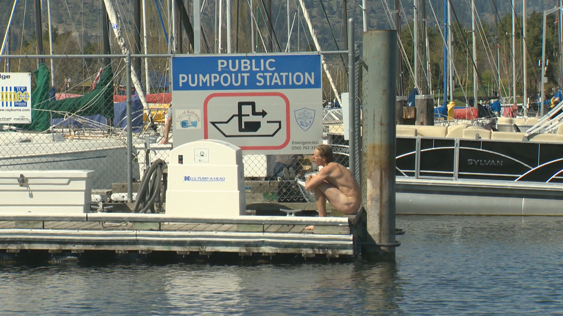 He then jumped into Okanagan Lake before getting onto a dock.