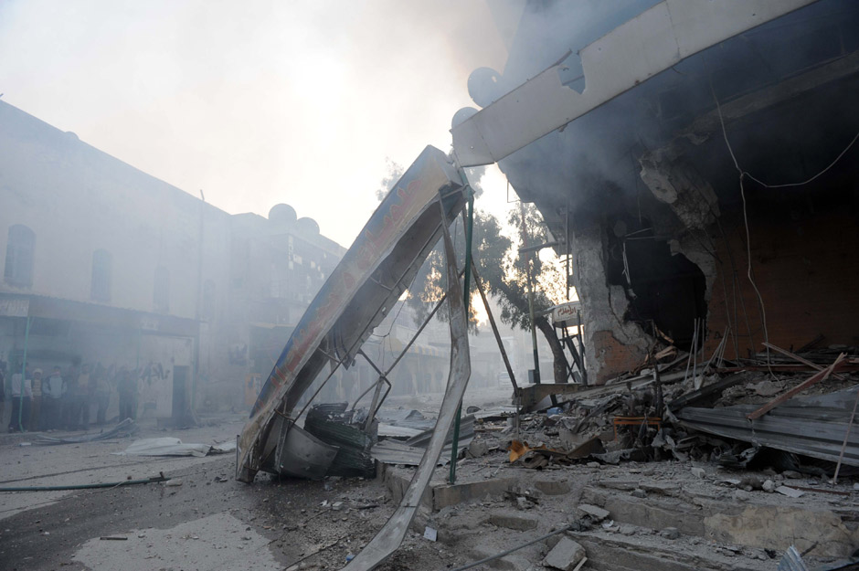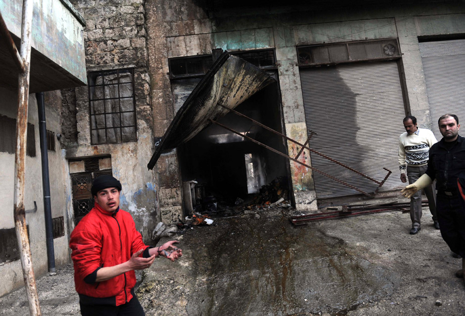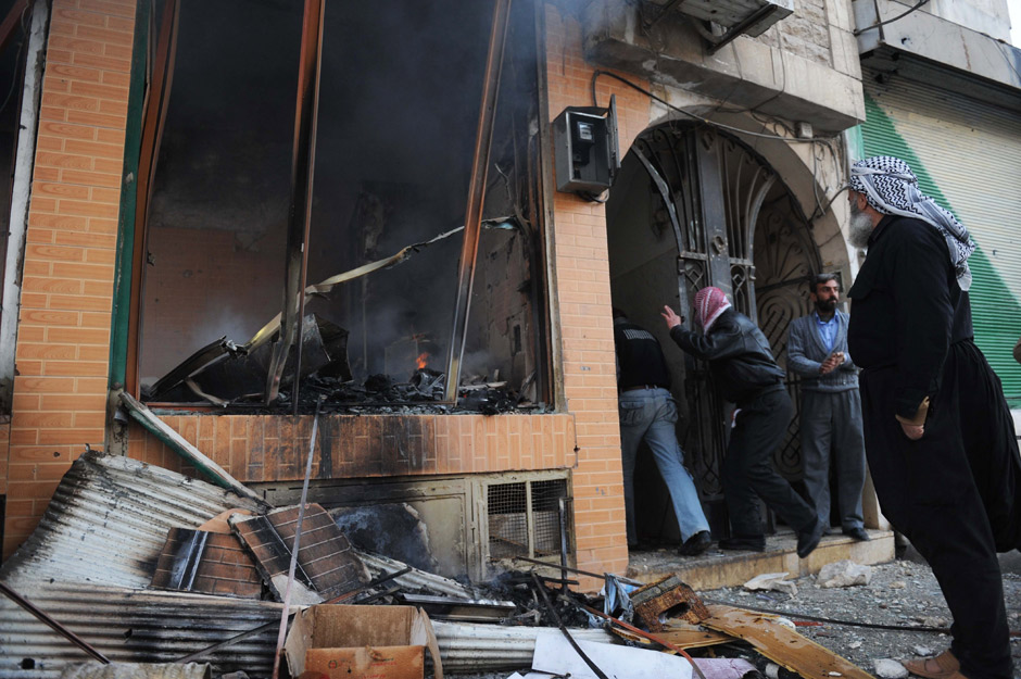 Human rights groups estimate between 68-75 people were killed in shooting, clashes and government troops shelling throughout Syria on Saturday. These photos show destroyed buildings and injured men in the center of the Syrian city of Idlib on February 24, 2012. Some photos contain graphic material.