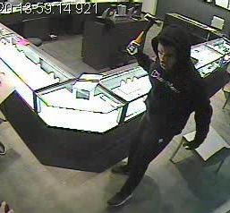 Investigators say the failed robbery happened on April 20 at Peoples Jewellery Store shortly before 1:55 p.m., when two masked suspects entered and smashed display cases with a small hammer.