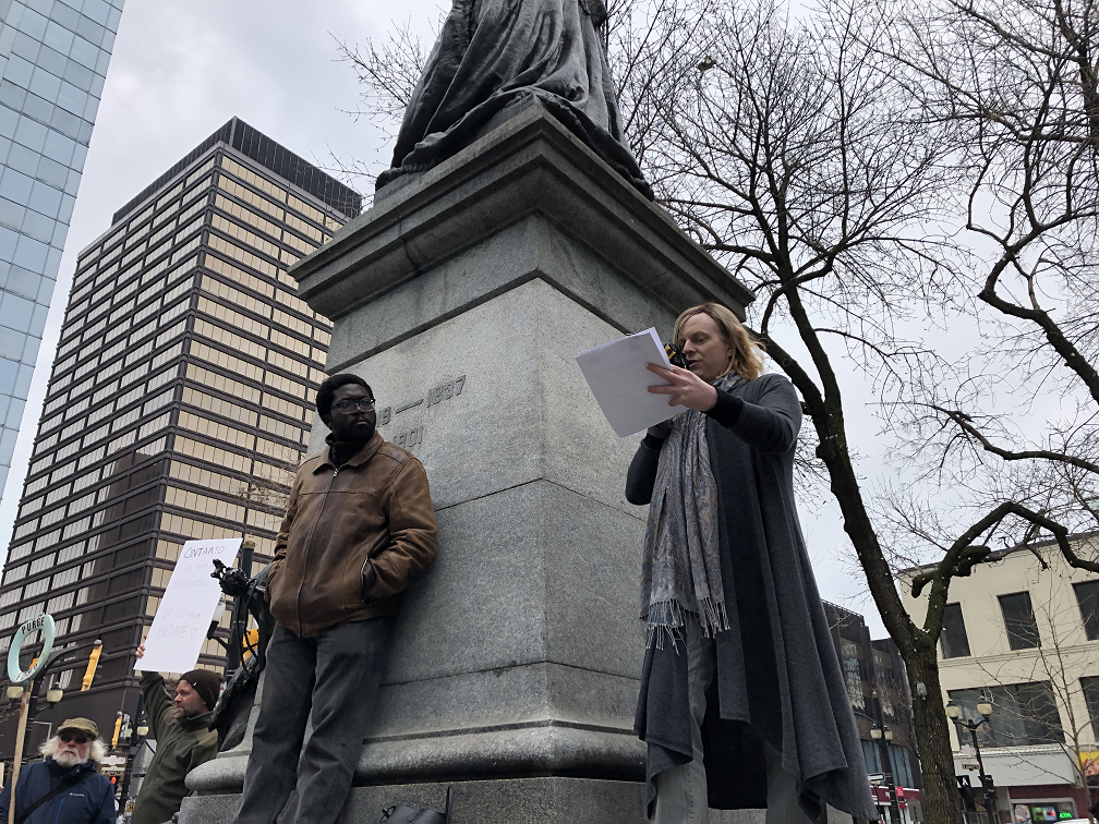 “We can’t stop work for the rest of the week because this will take more than just us,” said Lanktree as she addressed the crowd, standing on the Queen Victoria statue in Gore Park. “It will take the unions joining us, and we ask them to when they can. We will stand with them in this and there will be a moment for that. This is a beginning.”