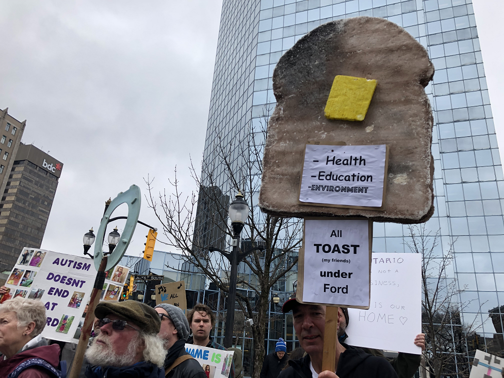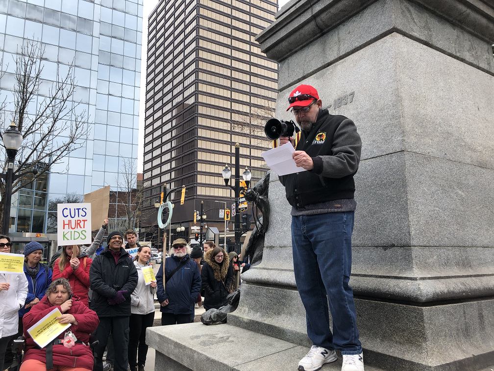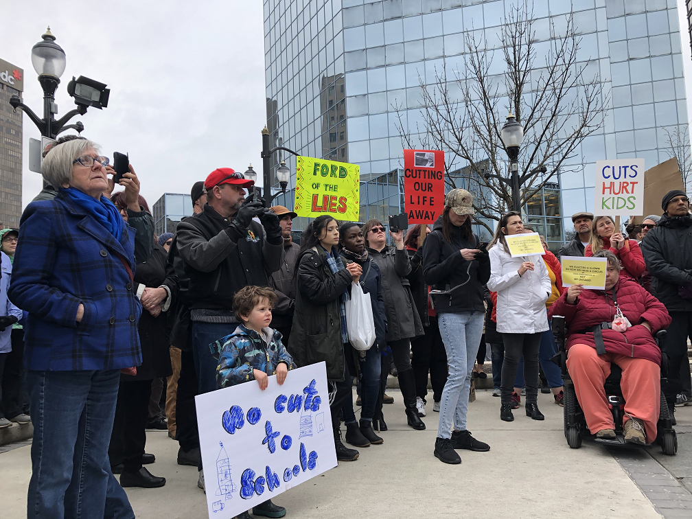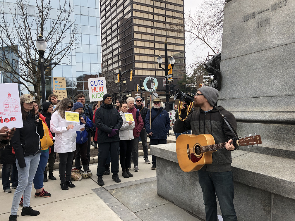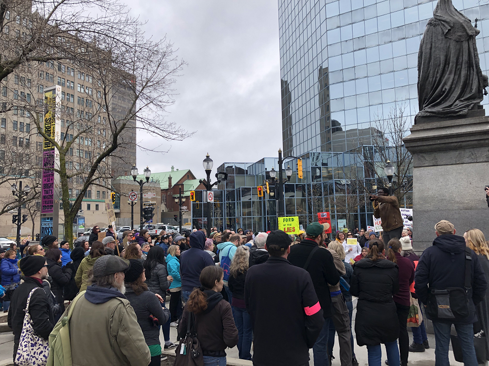 The rally in Gore Park was one of more than 20 events scheduled in cities across Ontario, with the goal of stopping work for an hour to protest provincial funding cuts to services like health care and education.
