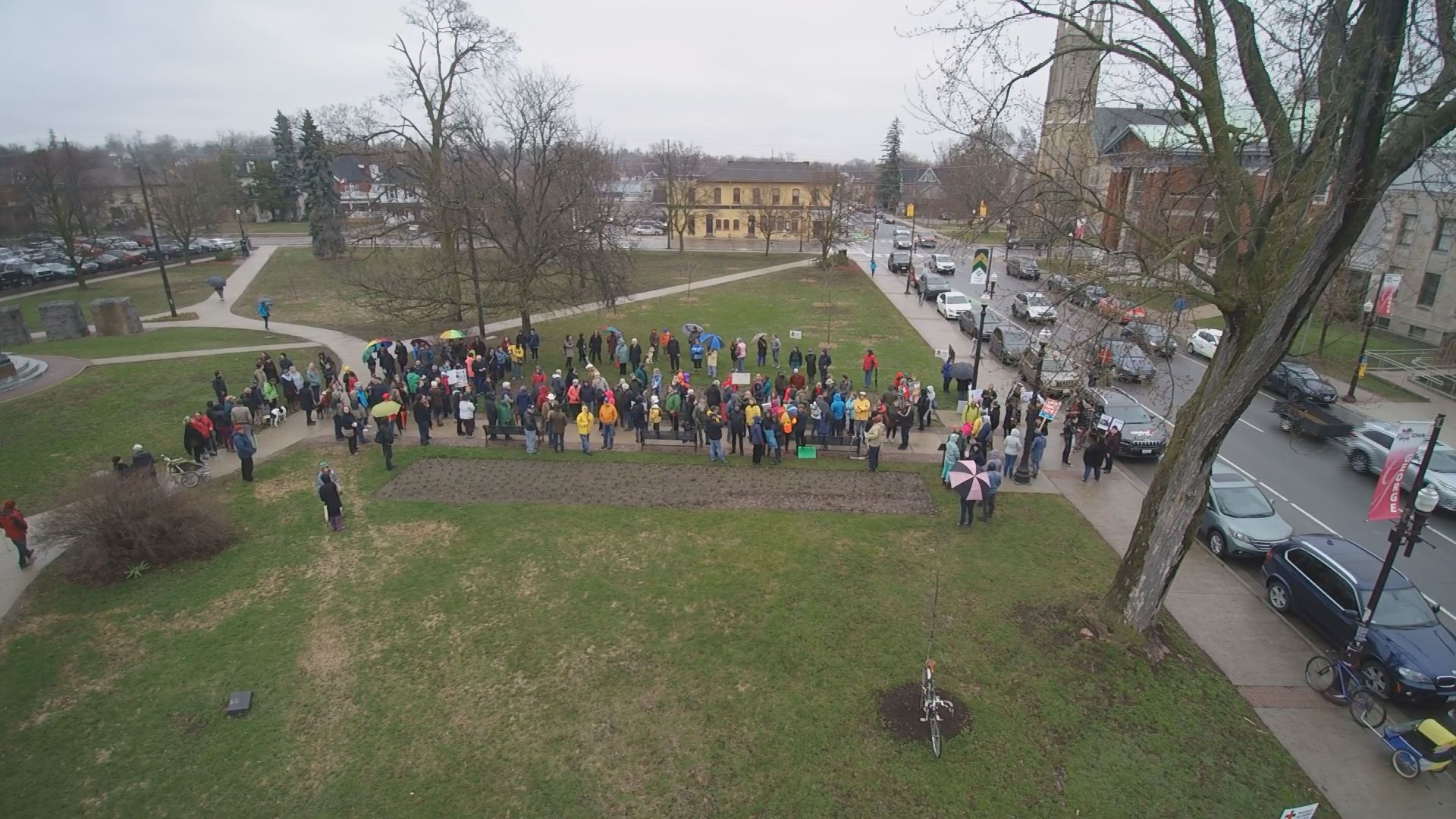 Close to 125 people gathered in Confederation Park to protest cuts by the provincial government.
