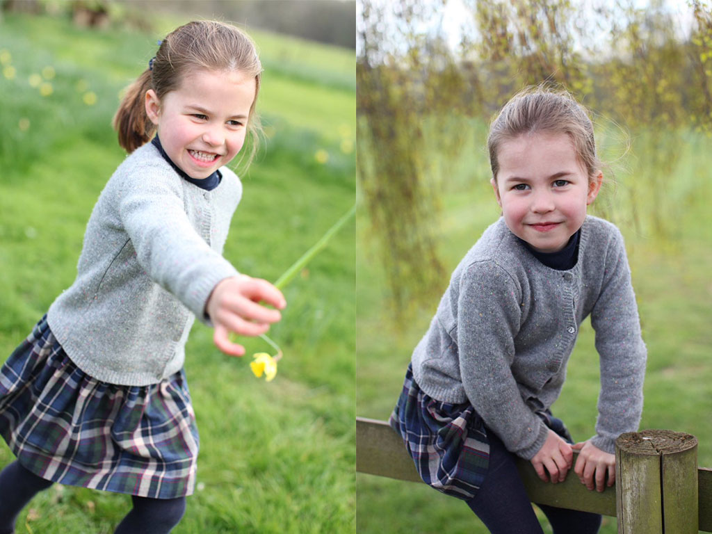 The portraits of the princess were taken at the family’s home in Norfolk, and show Charlotte playing with a flower in the garden and perched on a fence.