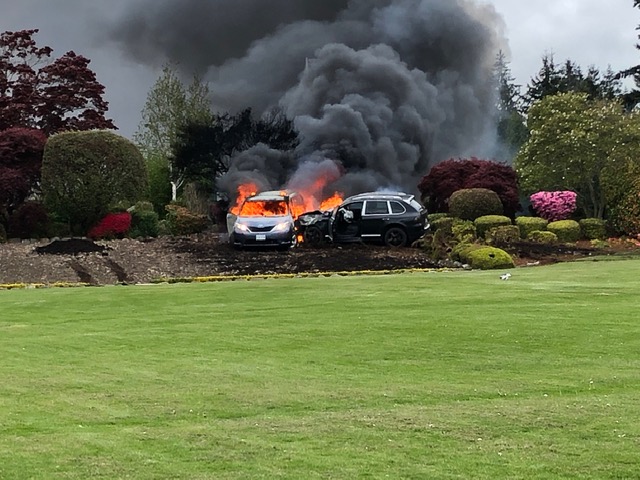 The van quickly burst into flames, and its sole occupant died at the scene. Surrey RCMP says police are still working with the BC Coroners Service to identify the victim.