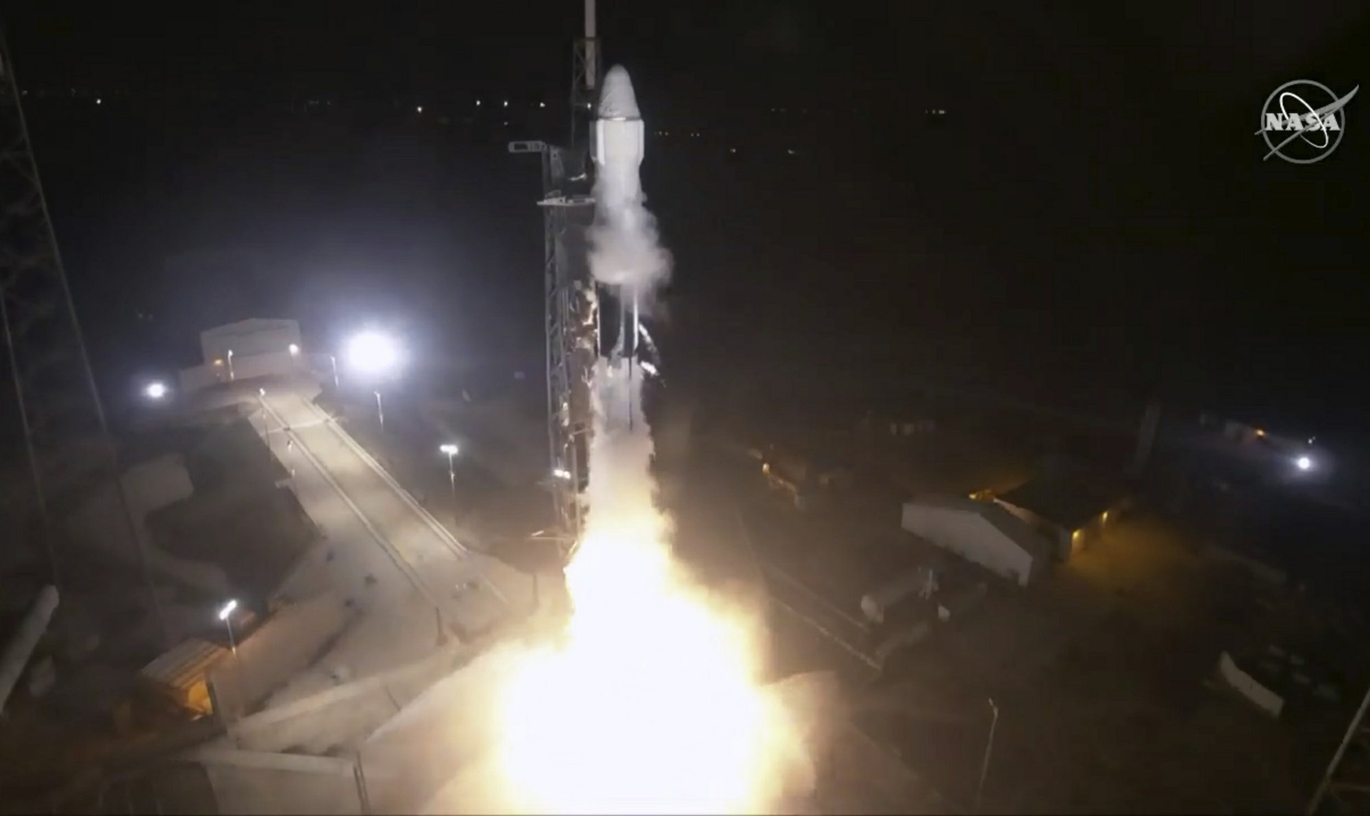 A Falcon rocket raced into the pre-dawn darkness, carrying a Dragon capsule with 5,500 pounds (2,500 kilograms) of goods. This recycled Dragon — which is making its second space trip — is due to arrive at the orbiting lab Monday.