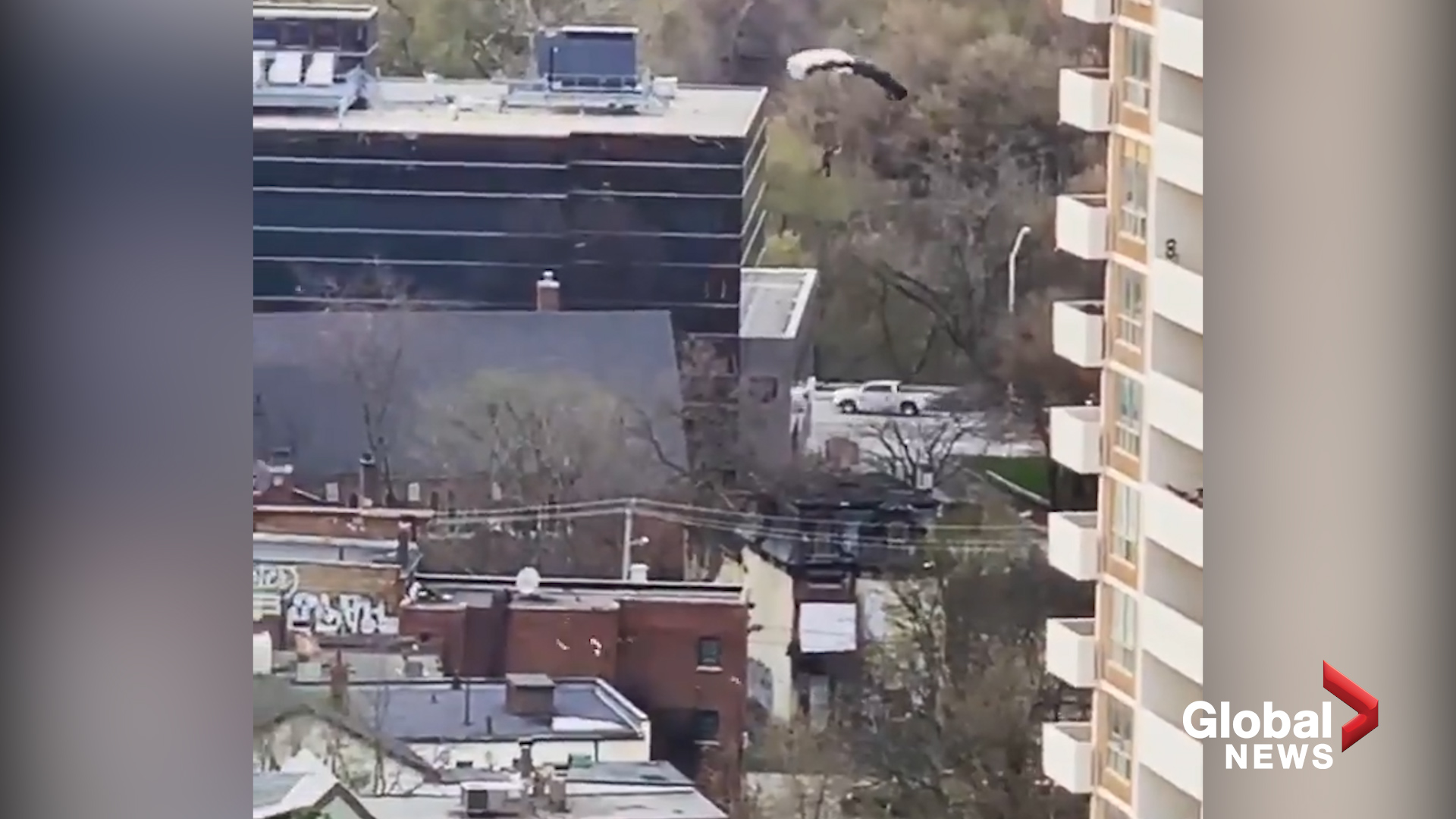 Toronto Police Const. David Hopkinson told Global News that parachuting is not allowed in the city, and that the culprit could be charged with mischief.