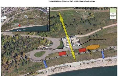The Louise McKinney beach, near the existing concession building, would feature chairs, umbrellas, a misting machine or shower, and a sloped grass sitting space beside a restaurant and patio likely to be constructed in 2014.
