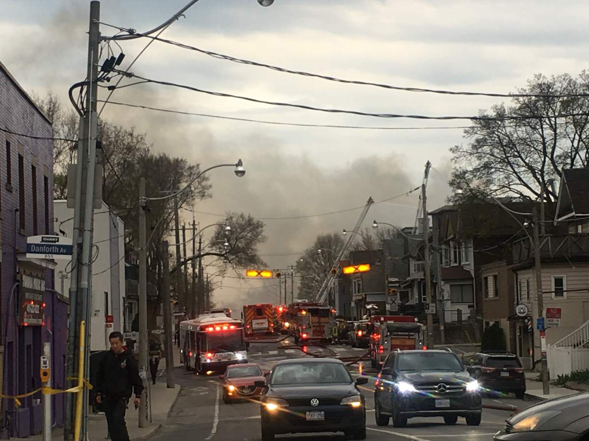 “This is a very challenging fire for our crews. There is very, very heavy smoke emanating and there are flames coming through the roof, which creates some additional hazards for our crews,” Toronto Fire Services Chief Matthew Pegg told reporters early Monday evening.