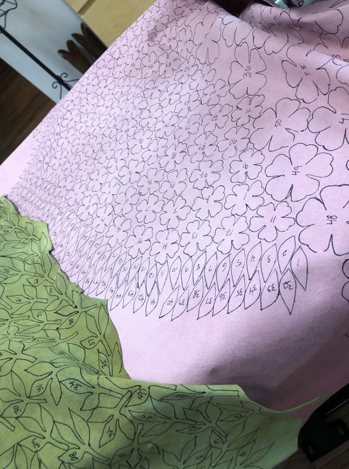 The three outfits have 900 applique pieces — leaves, petals and buds — that are made of lambskin.