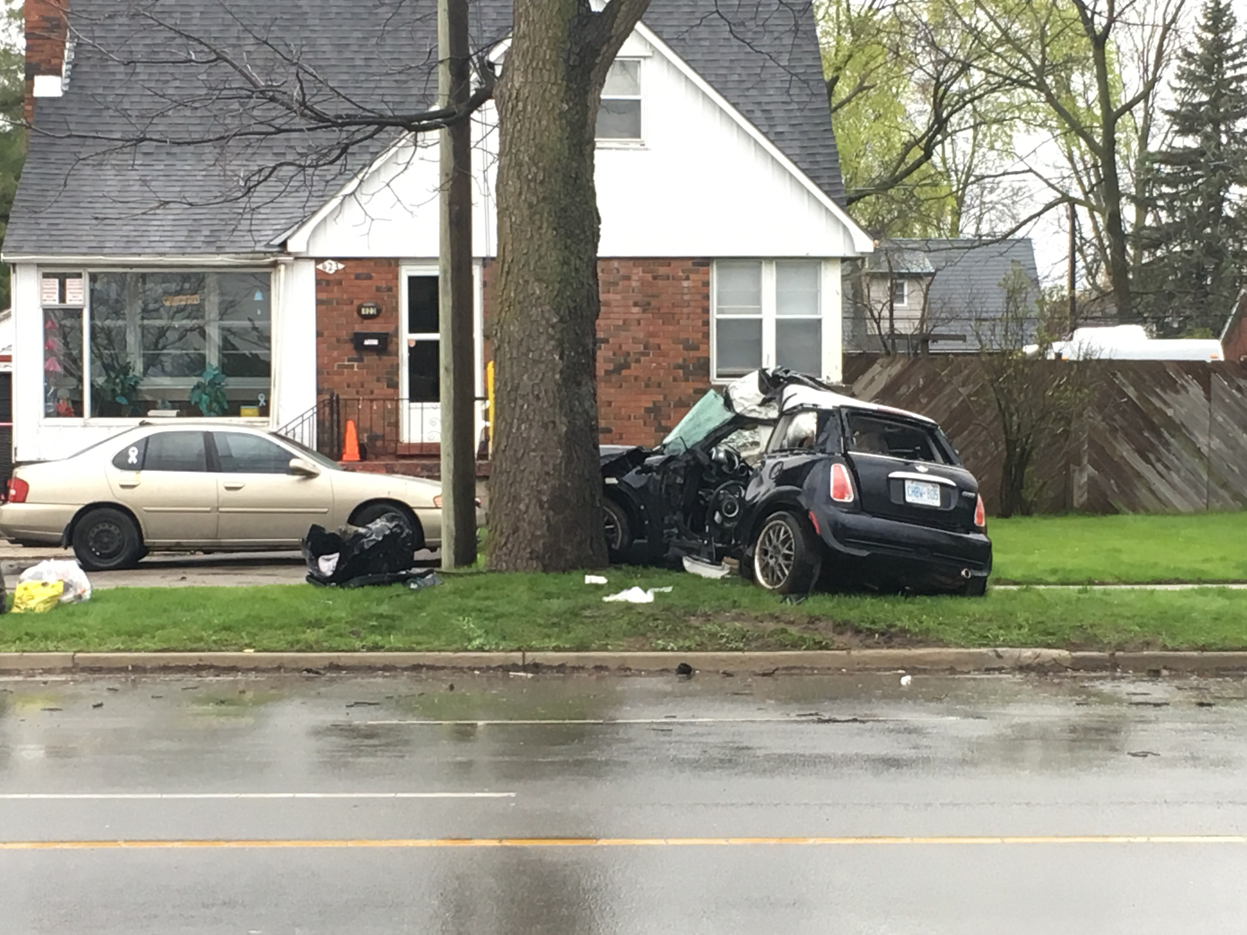 A heavily damaged black Mini Cooper remained on their front lawn around 8:30 a.m., as London police’s traffic reconstruction unit took measurements off the scene.