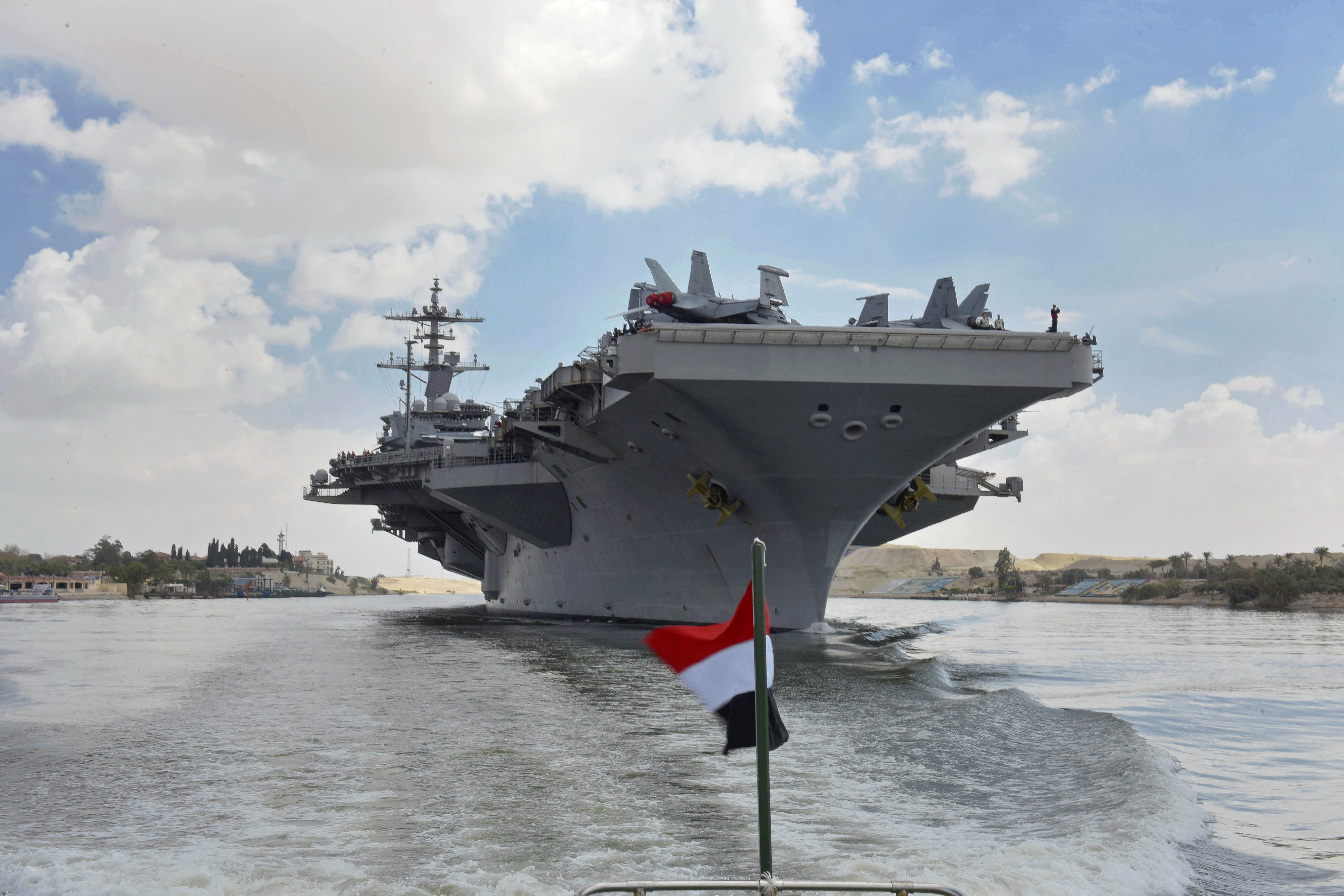 The carrier Abraham Lincoln, deployed as a warning to Iran, passed through Egypt’s Suez Canal on Thursday.