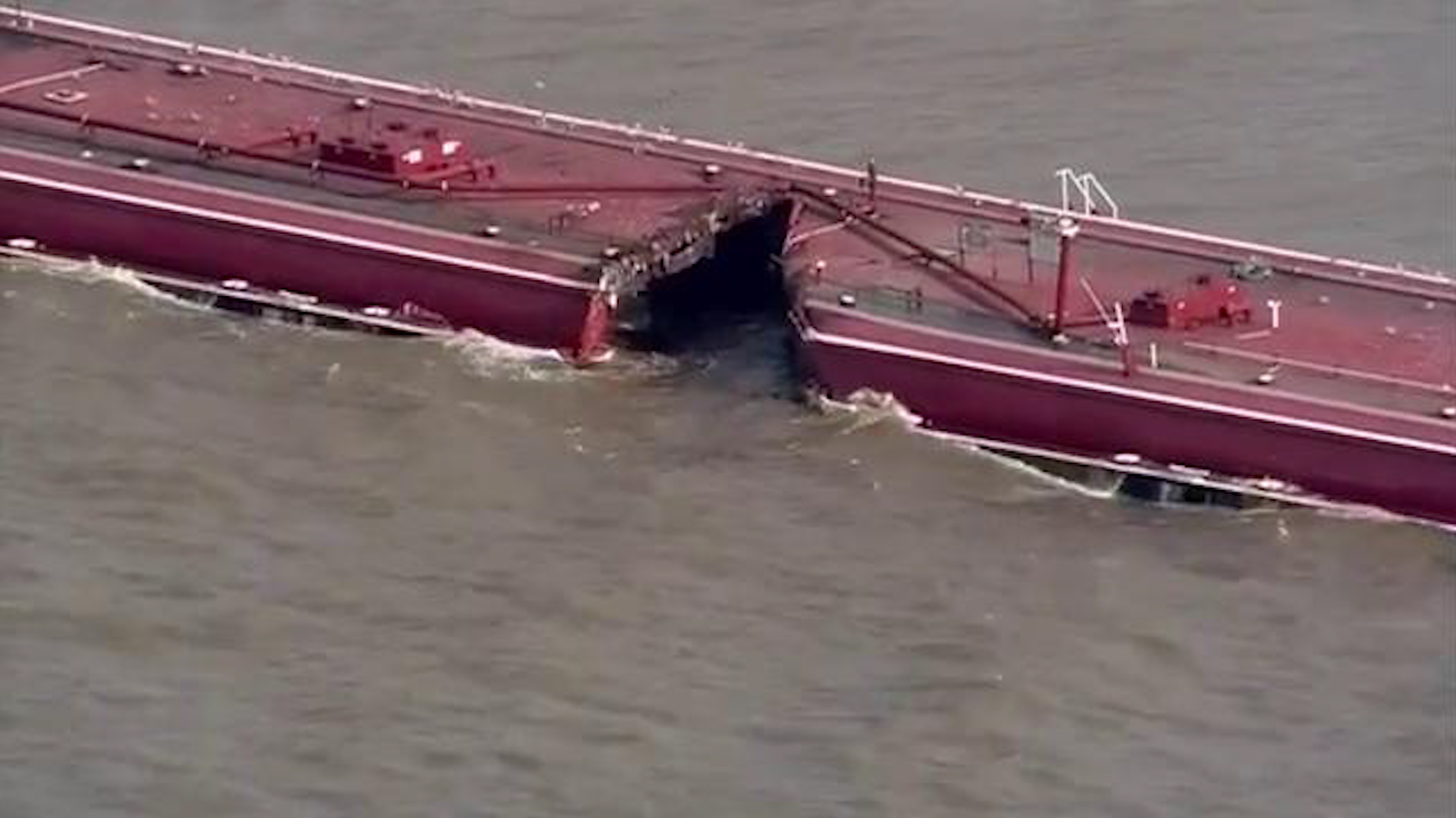 A 755-foot tanker collided with a tugboat pushing two barges near Bayport, Texas, around 3:30 p.m., capsizing one of the barges and damaging another, authorities said. The U.S. Coast Guard has set up an incident command and reported no injuries Friday night.