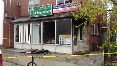 The fire started just before noon when Hamilton police and fire crews arrived at the building at 990 King Street W. which was engulfed in flames.