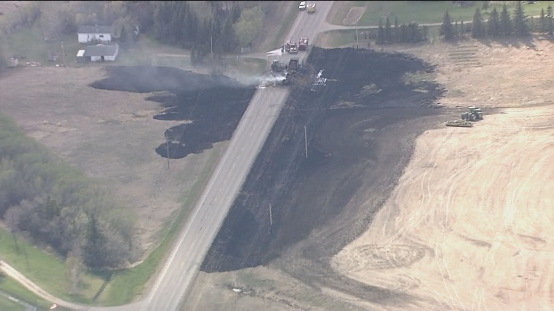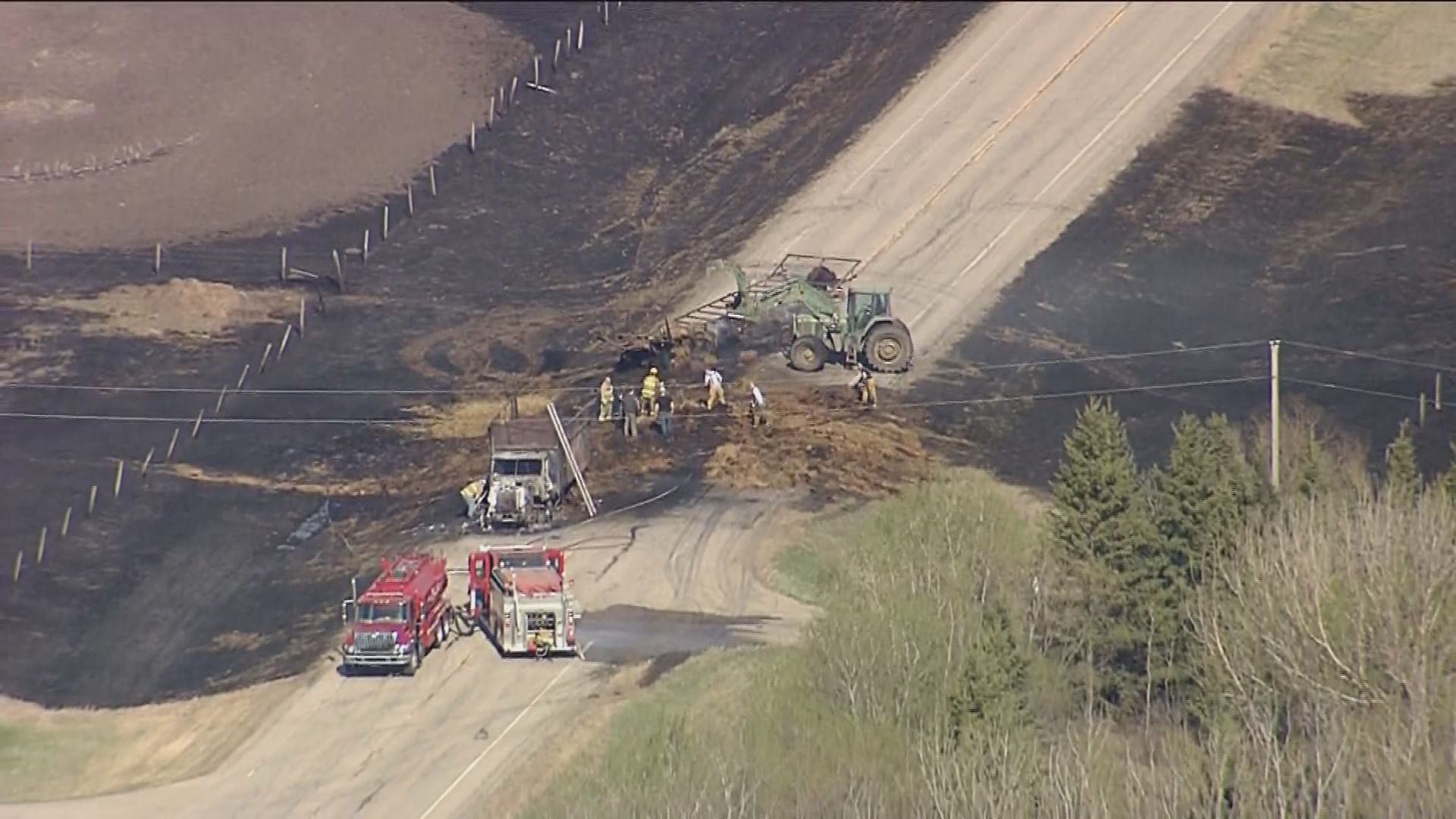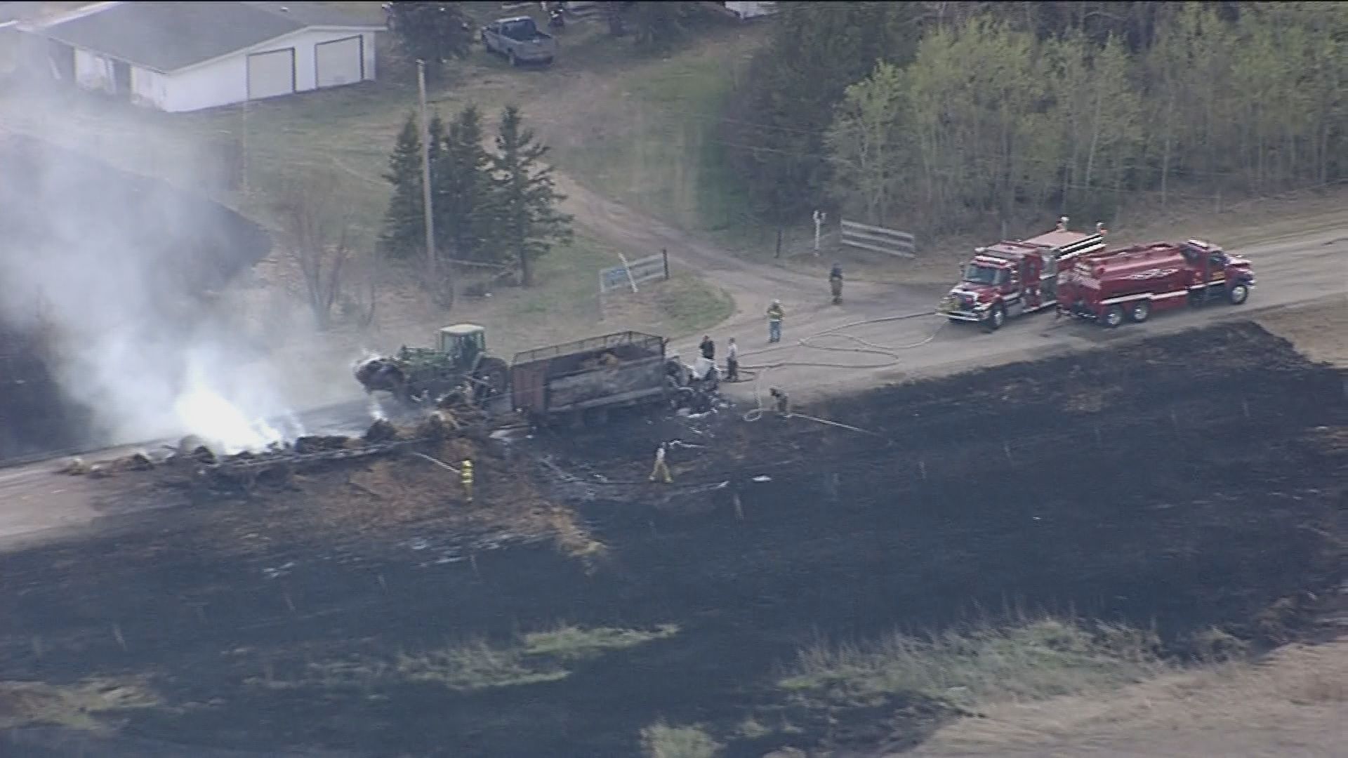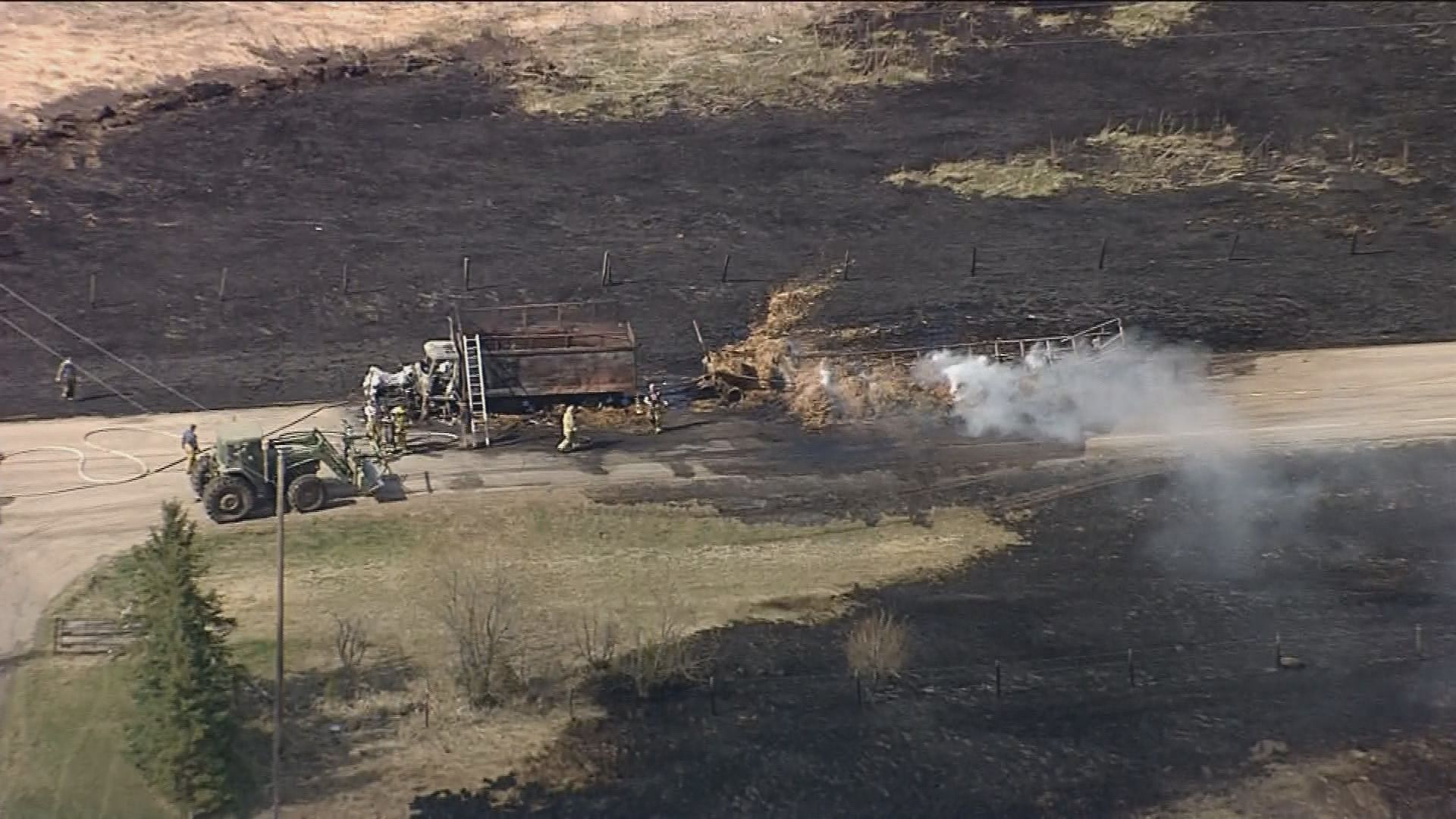 Video from the Global 1 news helicopter shortly before 5 p.m. showed a large area of scorched grass surrounding the truck. Emergency crews could be seen on scene.