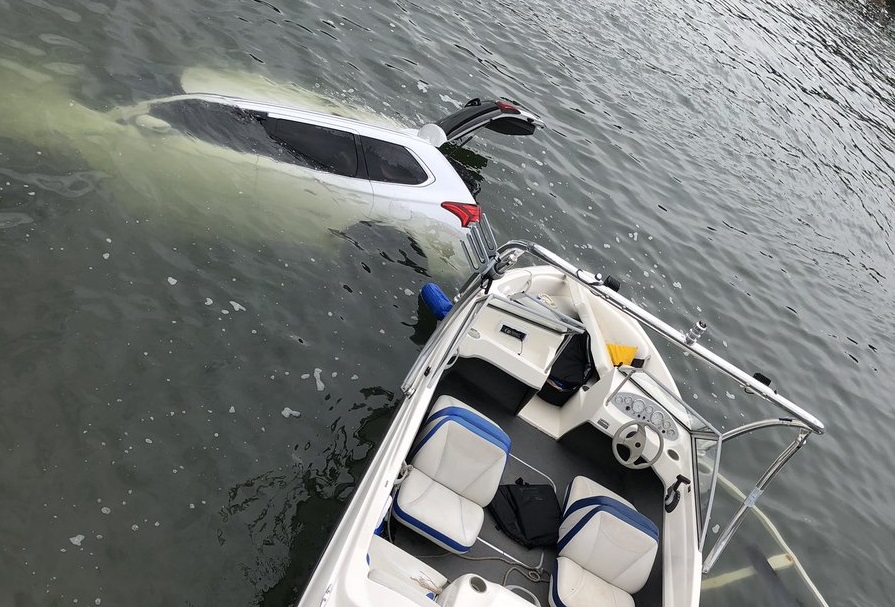 A tow truck was called to pull the car and boat out of the water, but pictures then showed a fire breaking out underneath the vehicle.