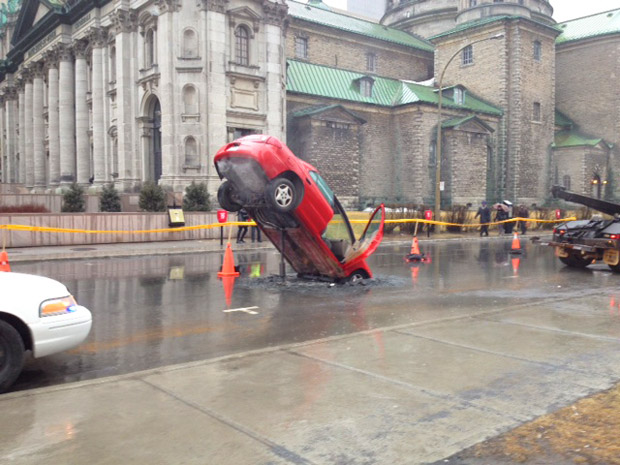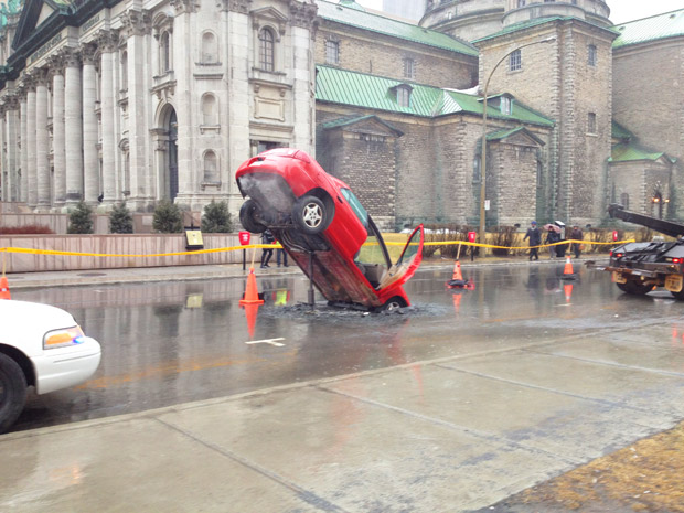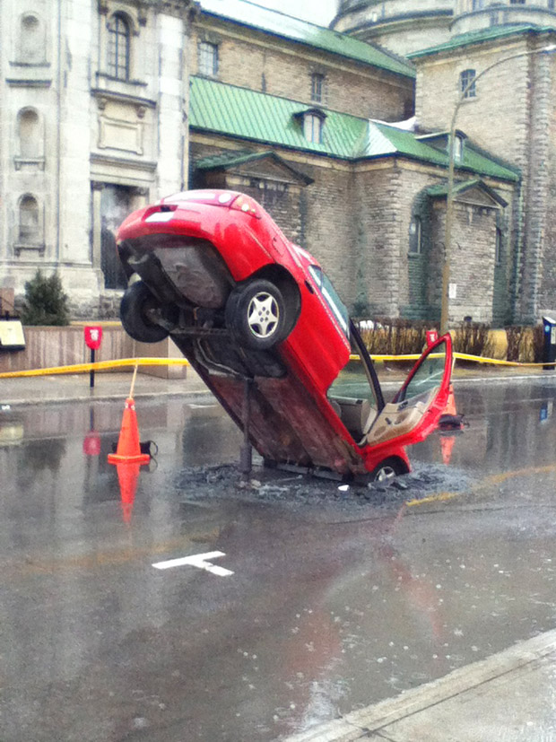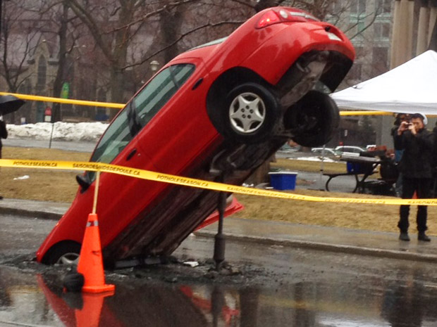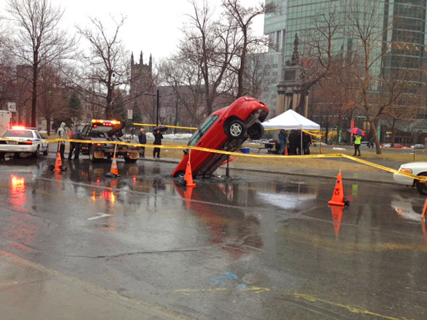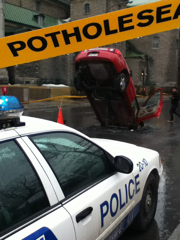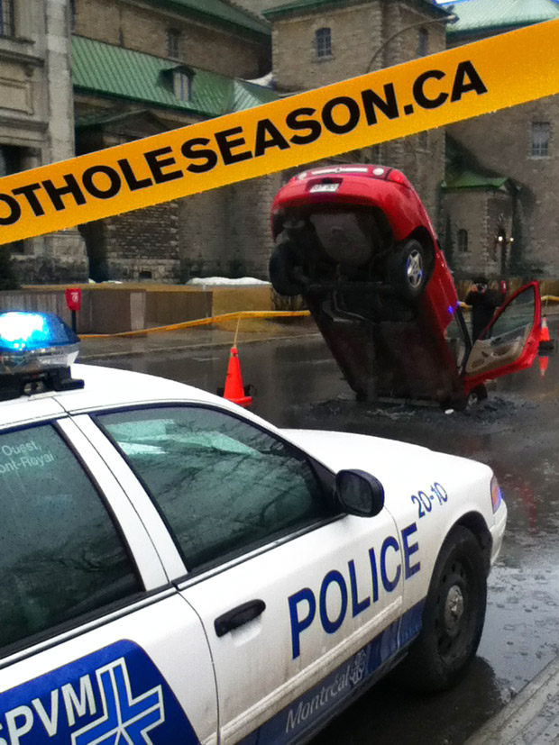 Yellow tape and police cars surrounded an upended red sports car, stuck in an enormous pothole in the road, motor still running. The scene was elaborately staged to launch a new app called potholeseason.ca.