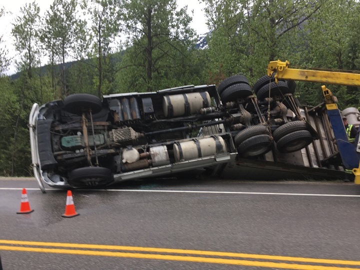 A semi is on its side approximately two kilometres west of Three Valley Gap, which is located around 27 kilometres southwest of Revelstoke.