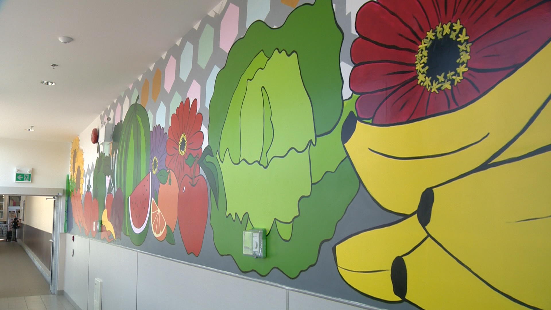The mural, in the enclosed corridor between the mall and Safeway, features colourful fruits and vegetables on a honeycomb background.