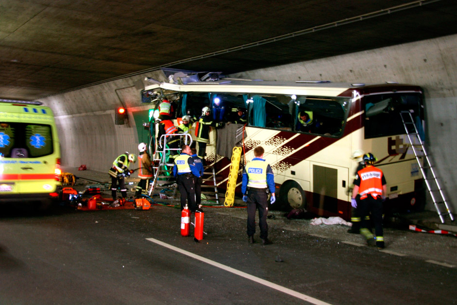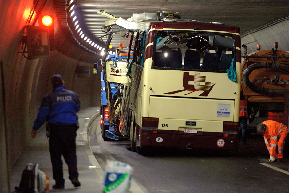 View full screen View full screen View full screen View full screen View full screen View full screen View full screen View full screen Previous Image Next Image Close Modal Gallery GENEVA – A tour bus slammed into a tunnel wall in the Swiss Alps in a horrific accident that killed 22 school children and six adults returning to Belgium from a joyous ski vacation, police said Wednesday. Here are some photos of the scene.