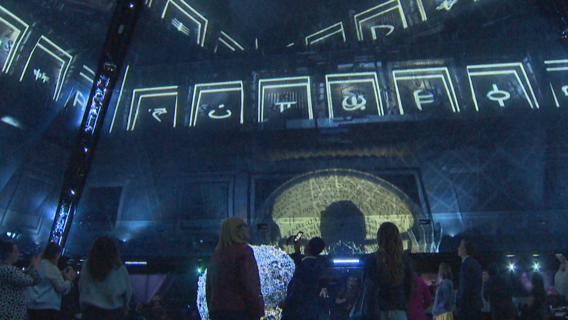 The “experience” involves graphics and patterns projected onto the walls of the principal pyramid, while lit shapes move up and down from the roof and music plays in the background.