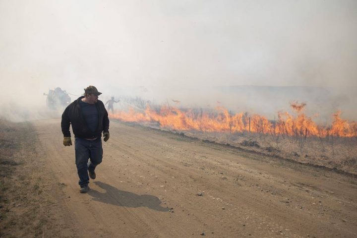 An onlooker walks past a brush fire near Biggar, Sask., on Tuesday, April 23, 2019. Kayle Neis / The Canadian Press