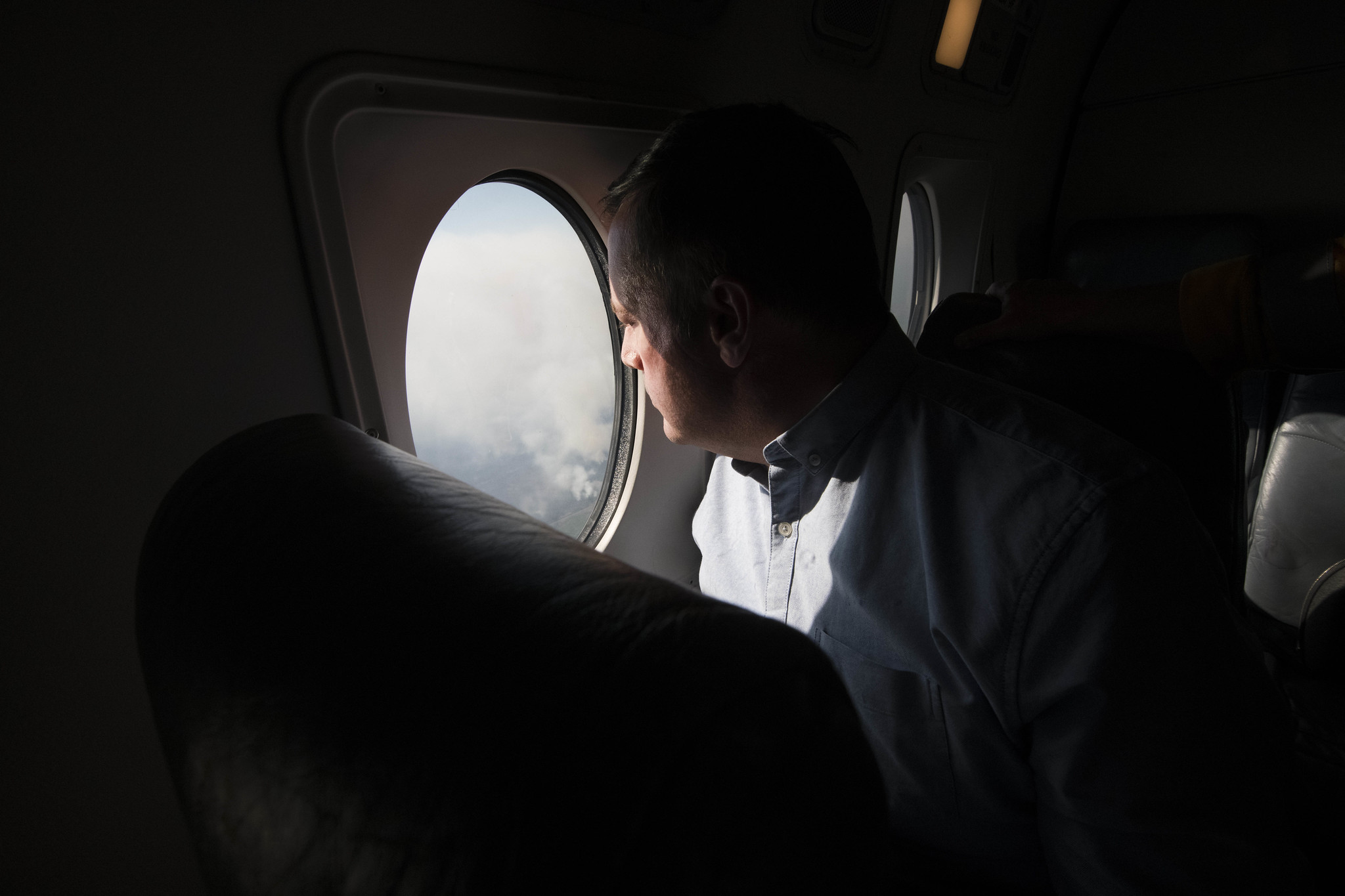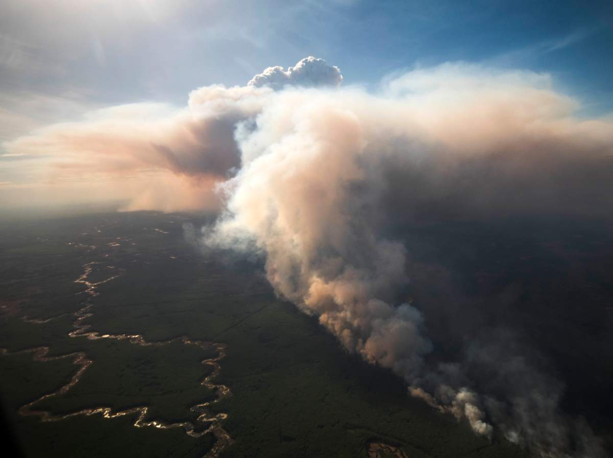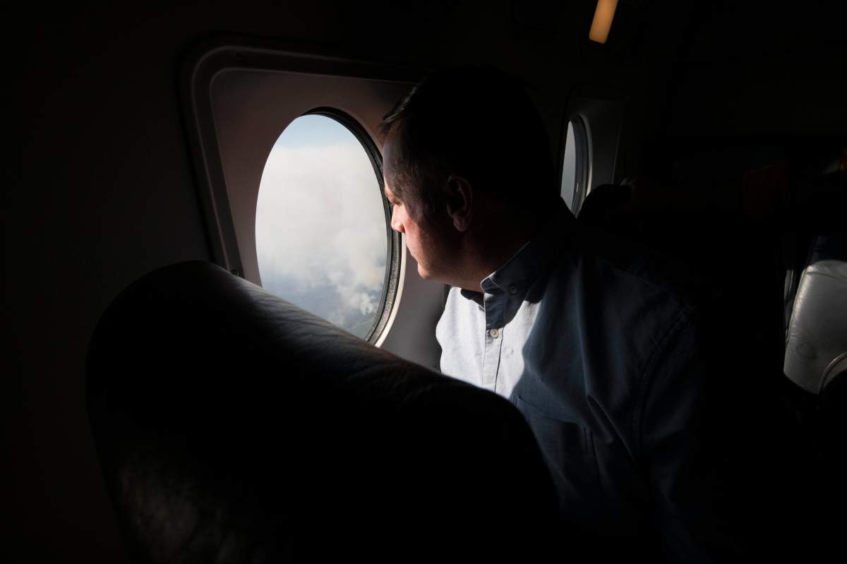 The photos of the premier’s tour posted on the government of Alberta’s Flickr account show massive clouds of smoke rising from the burning forest.