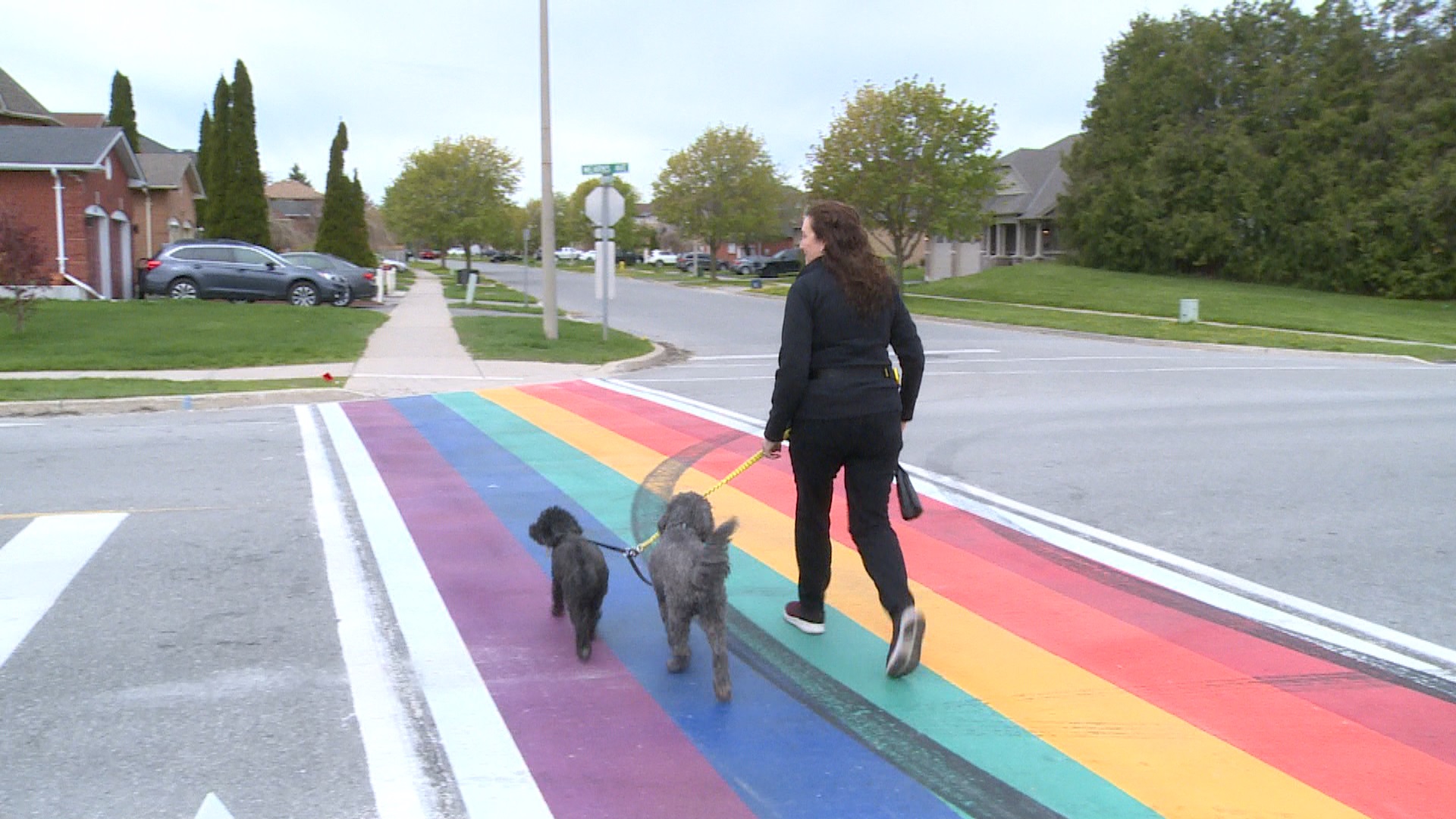 The Bowmanville rainbow crosswalk is the first in the region. The giant stick was rolled out Monday evening at the intersection of Mearns Ave and Apple Blossom Boulevard. By Wednesday morning someone had already vandalized the colorful crosswalk.