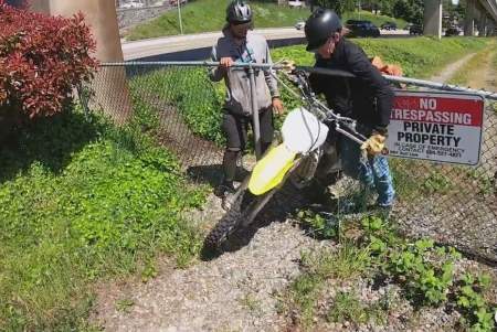 Video posted to Roberton’s YouTube channel shows his point of view as he pulls off the road and approaches the two men as they try to push the dirt bike through a ripped chainlink fence.