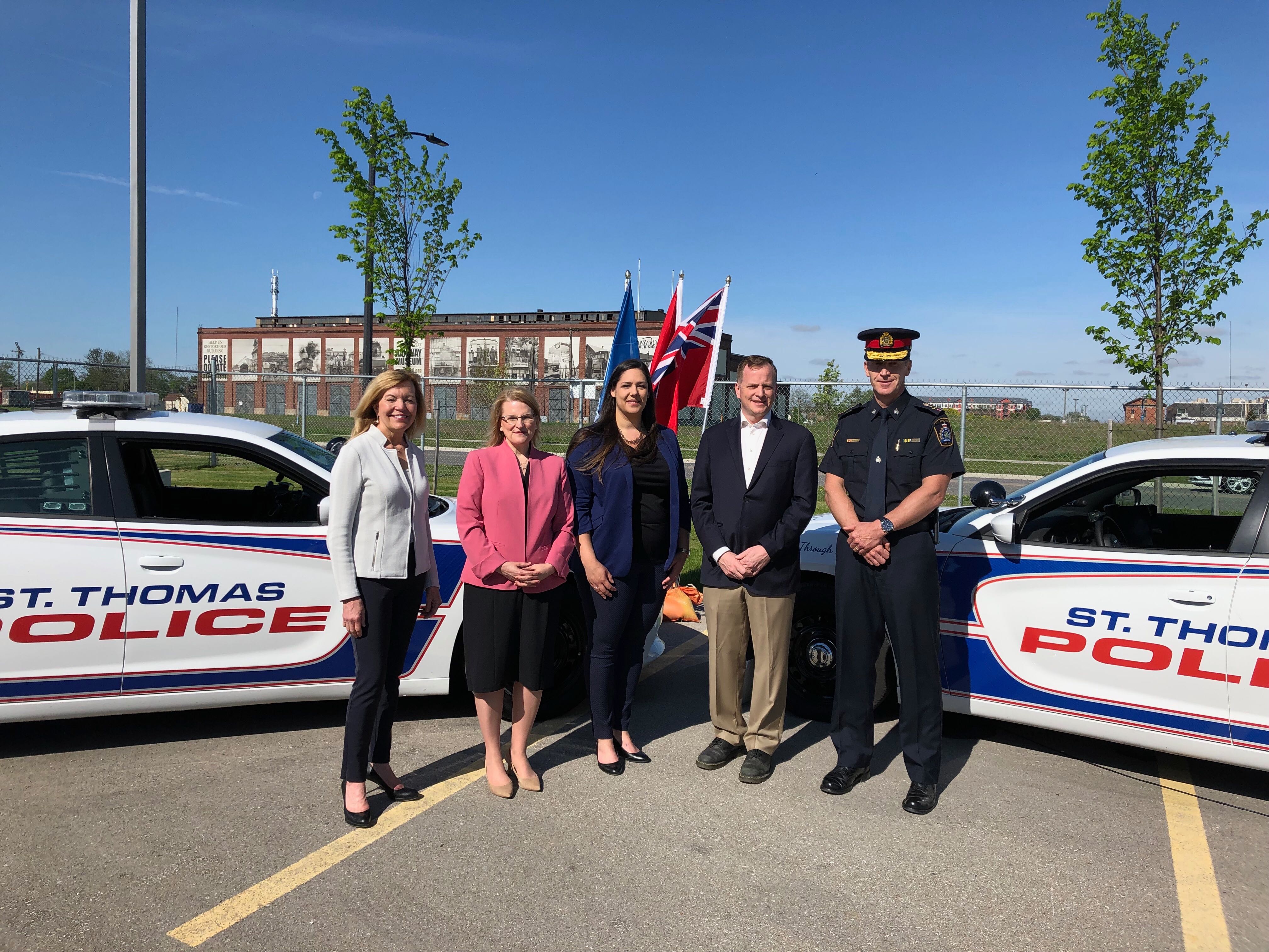 Deputy Premier Christine Elliott, left, Solicitor General Sylvia Jones, second from left, Transportation Minister Jeff Yurek, second from right, and St. Thomas police Chief Chris Herridge, right. Andrew Graham / 980 CFPL
