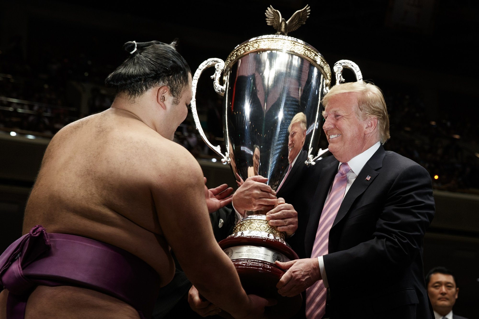 When it was over, Trump did what no other American president has done. Climbing into the elevated dirt ring, or “dohyo,” in ceremonial slippers, Trump presented a hulking 27-kg trophy to the tournament champion — a cup that Trump said he hoped would be used for “many hundreds of years.”