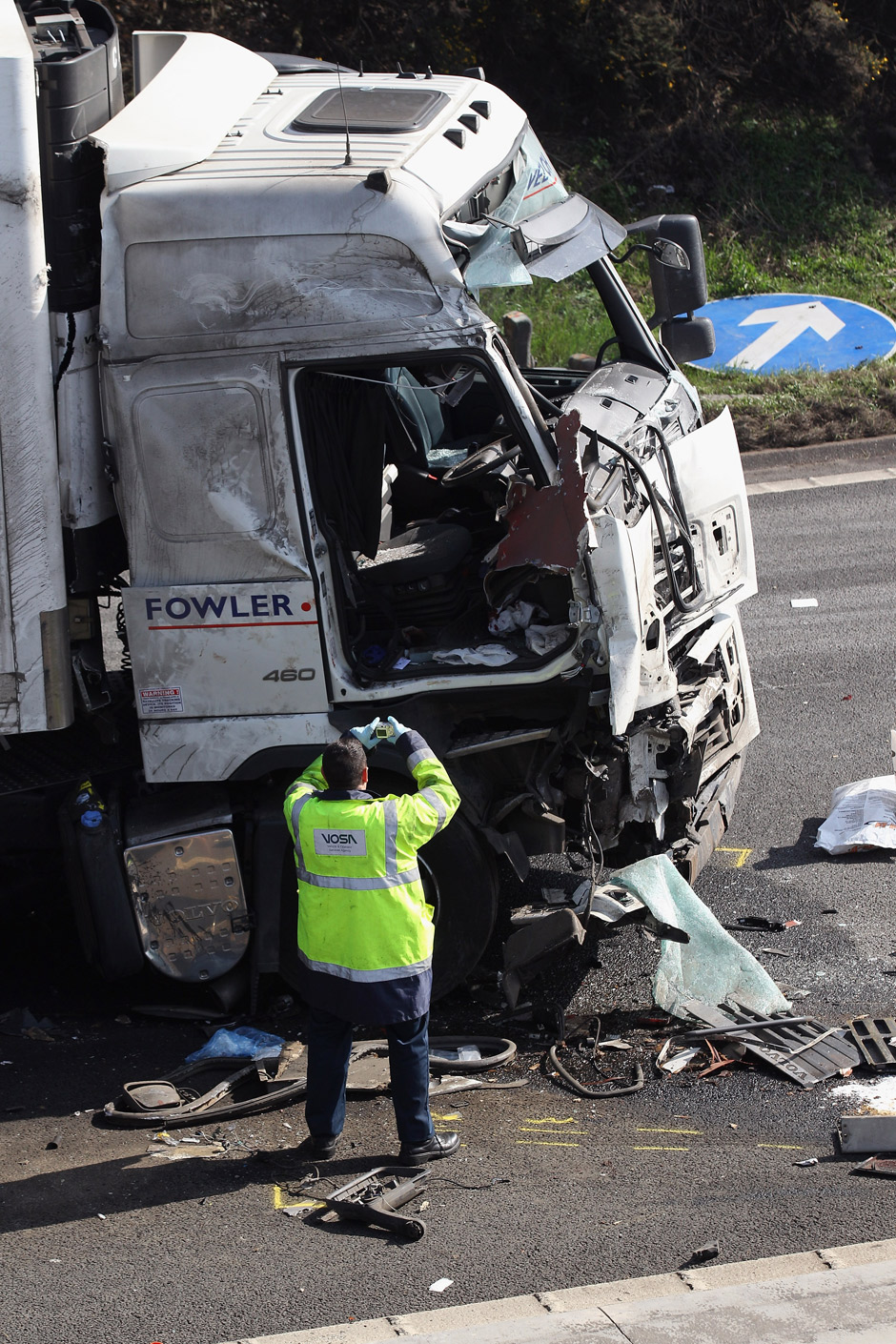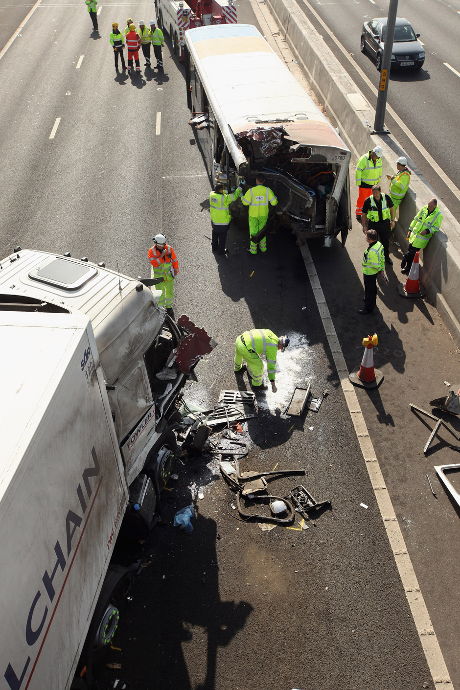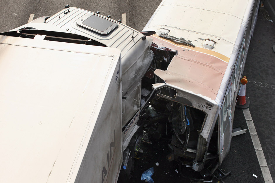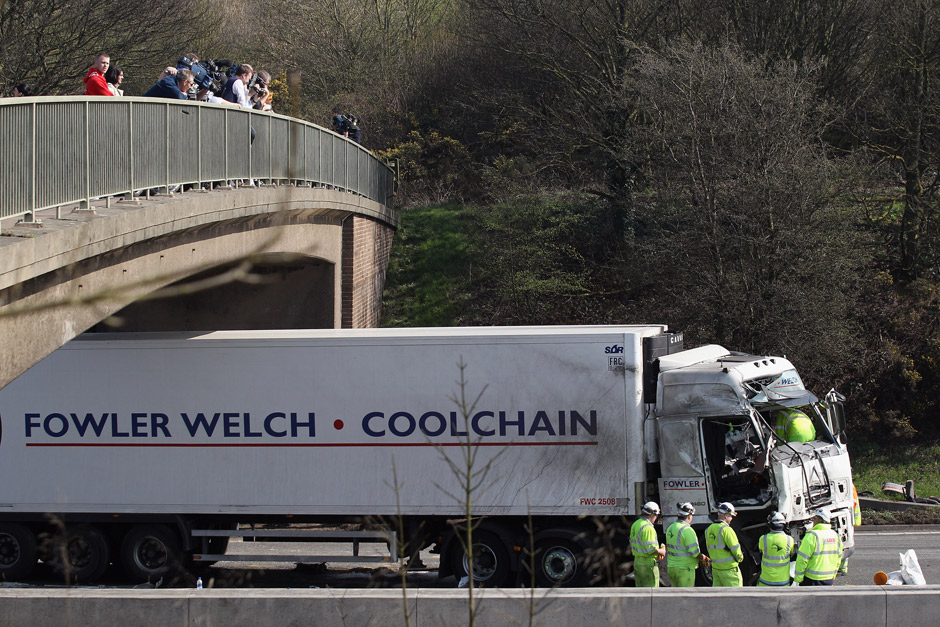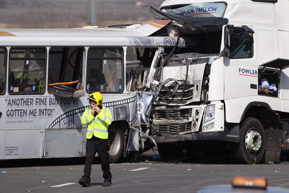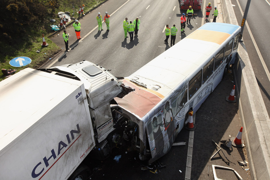 TORONTO – We look at the scene of a fatal crash on the M5 motorway involving a bus and a lorry (truck) on March 24, 2012 in Frankley, England. One person is reported to have died and 39 others sustained injuries from the crash. The collision occurred on the southbound carriageway near to Frankley Services between junctions 3 and 4 at 6:24am. It is believed the bus was travelling from Birmingham to Evesham when it broke down and was struck from behind by the truck whilst stationary on the hard shoulder in thick fog.Â
