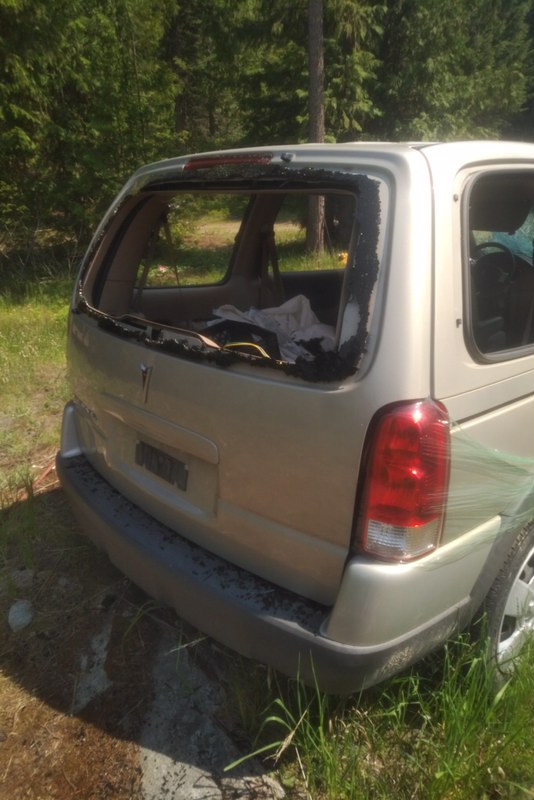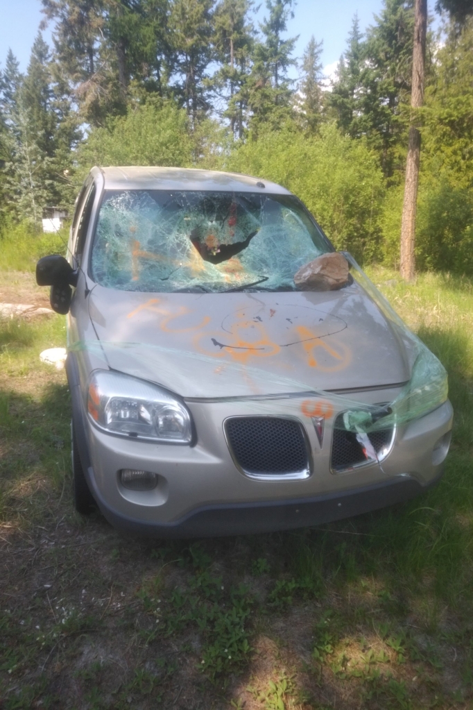 Broken glass and large rocks surround the vandalized vehicles on the Fedoriuk family property southeast of Kelowna near Myra Canyon.