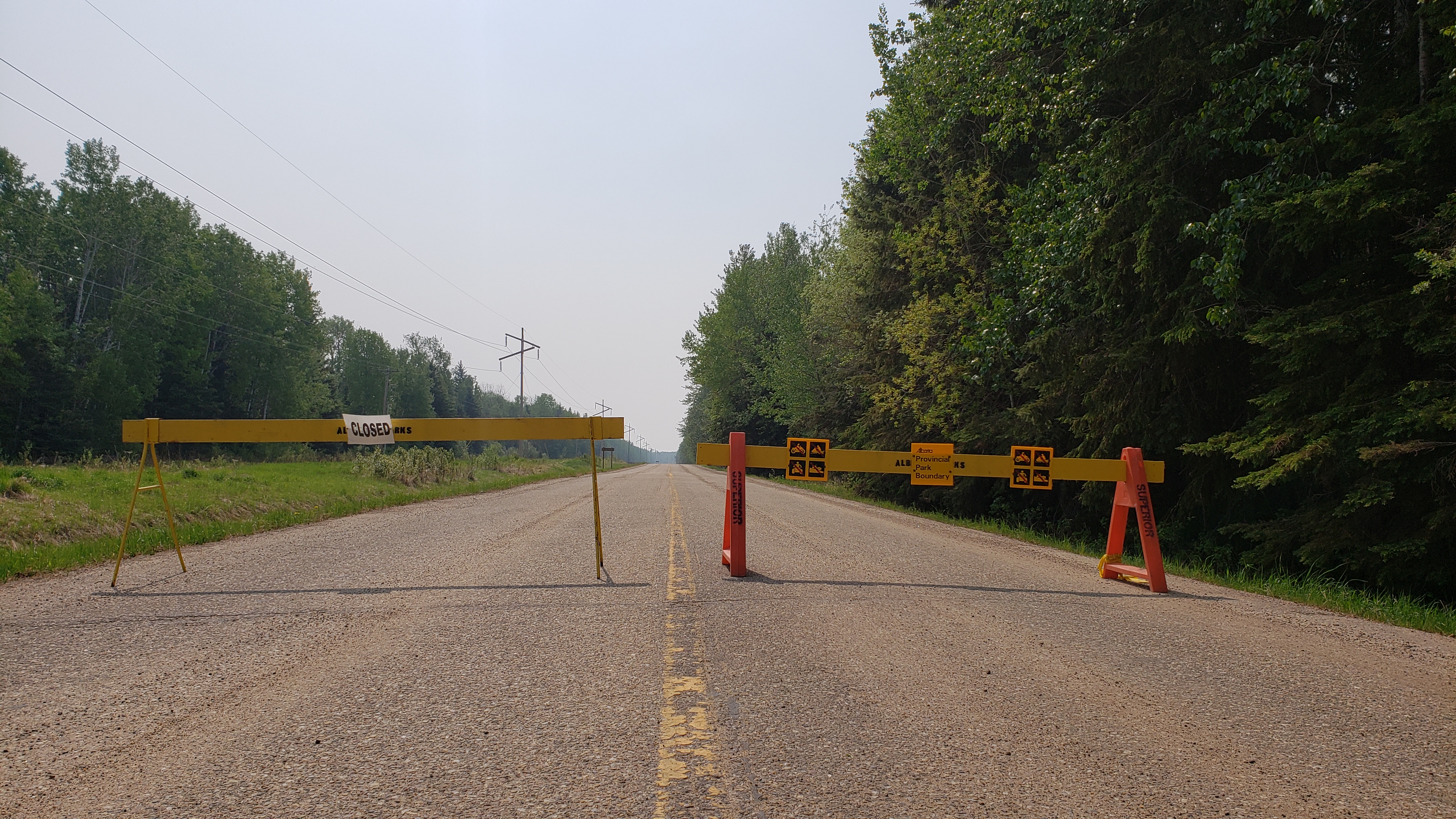 Smoke from the fires enveloped points south, including Edmonton, in a acrid haze that limited visibility and made it difficult to breathe. The thick smoke turned otherwise blue skies an eerie grey-orange across Alberta.